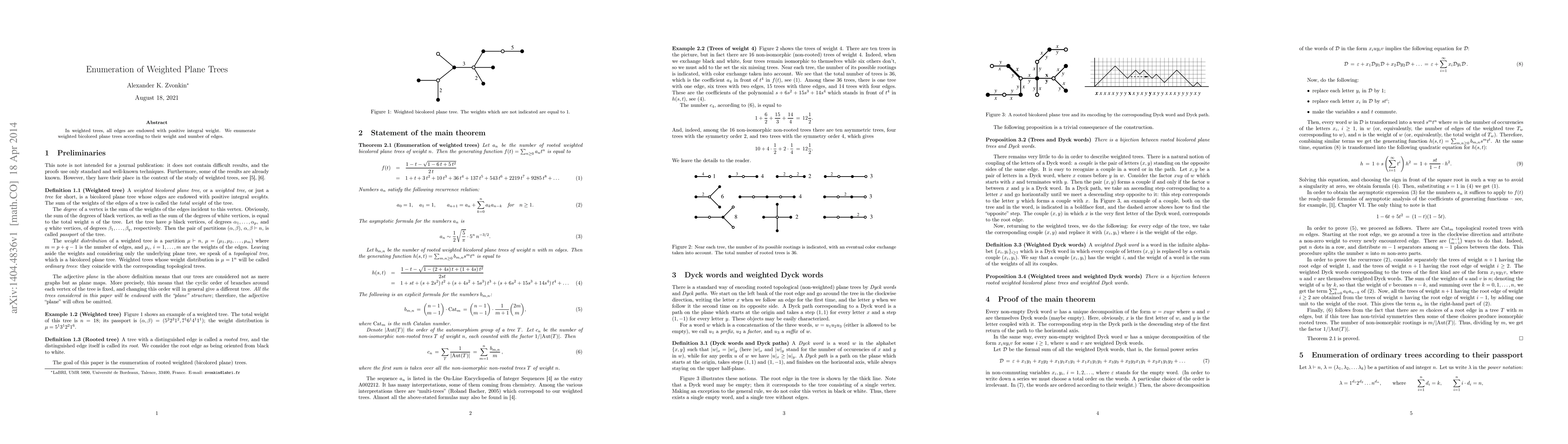 Summary: This paper enumerates weighted bicolored plane trees based on their edge weights and counts, providing a systematic approach to understanding the structure and distribution of these trees. The focus is on the combinatorial properties of such trees.