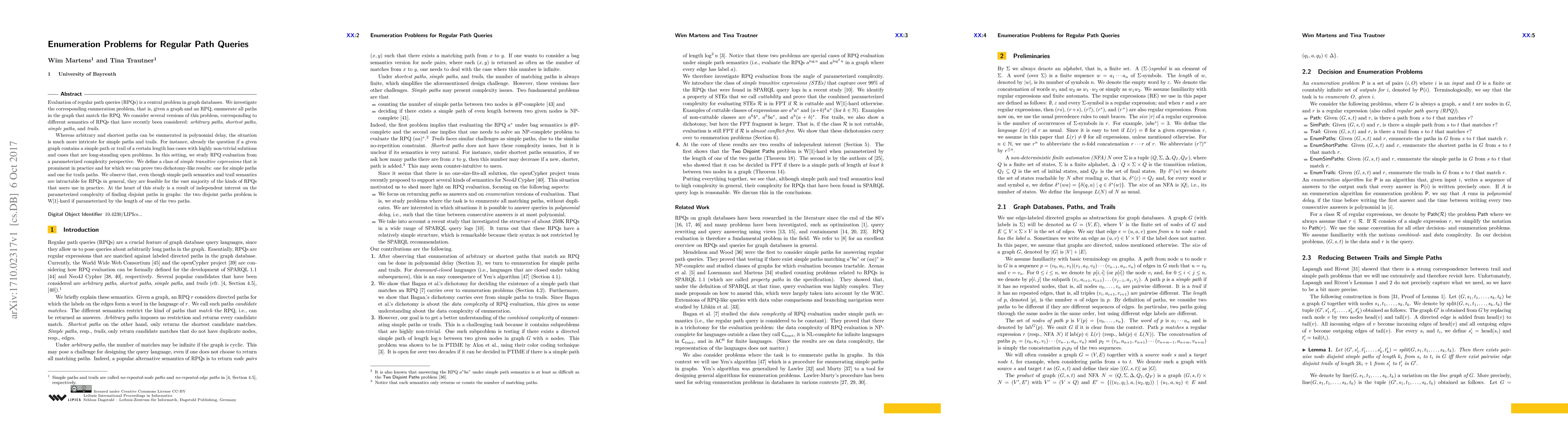 This paper investigates the enumeration of regular path queries in graph databases, focusing on different semantics such as arbitrary, shortest, simple, and trail paths. It finds that while arbitrary and shortest paths can be enumerated in polynomial delay, simple paths and trails pose more complex challenges, often leading to long-standing open problems. The study introduces a class of simple transitive expressions and proves dichotomy-like results for simple paths and trail paths, showing practical feasibility despite general intractability.