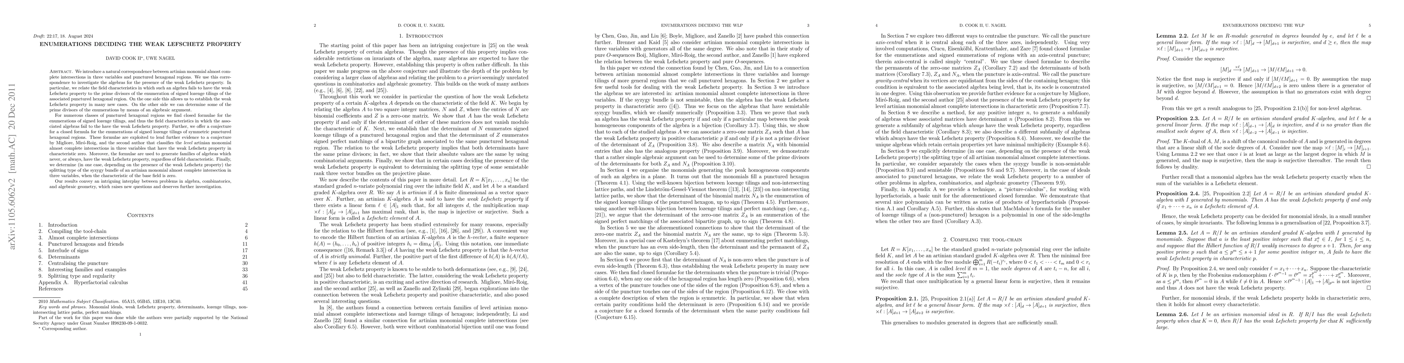 We introduce a natural correspondence between artinian monomial almost complete intersections in three variables and punctured hexagonal regions. We use this correspondence to investigate the algebras for the presence of the weak Lefschetz property. In particular, we relate the field characteristics in which such an algebra fails to have the weak Lefschetz property to the prime divisors of the enumeration of signed lozenge tilings of the associated punctured hexagonal region. On the one side this allows us to establish the weak Lefschetz property in many new cases. For numerous classes of punctured hexagonal regions we find closed formulae for the enumerations of signed lozenge tilings, and thus the field characteristics in which the associated algebras fail to the have the weak Lefschetz property. Further, we offer a conjecture for a closed formula for the enumerations of signed lozenge tilings of symmetric punctured hexagonal regions. These formulae are exploited to lend further evidence to a conjecture by Migliore, Mir\'o-Roig, and the second author that classifies the {\em level} artinian monomial almost complete intersections in three variables that have the weak Lefschetz property in characteristic zero. Moreover, the formulae are used to generate families of algebras which never, or always, have the weak Lefschetz property, regardless of field characteristic. Finally, we determine (in one case, depending on the presence of the weak Lefschetz property) the splitting type of the syzygy bundle of an artinian monomial almost complete intersection in three variables, when the characteristic of the base field is zero. Our results convey an intriguing interplay between problems in algebra, combinatorics, and algebraic geometry, which raises new questions and deserves further investigation.