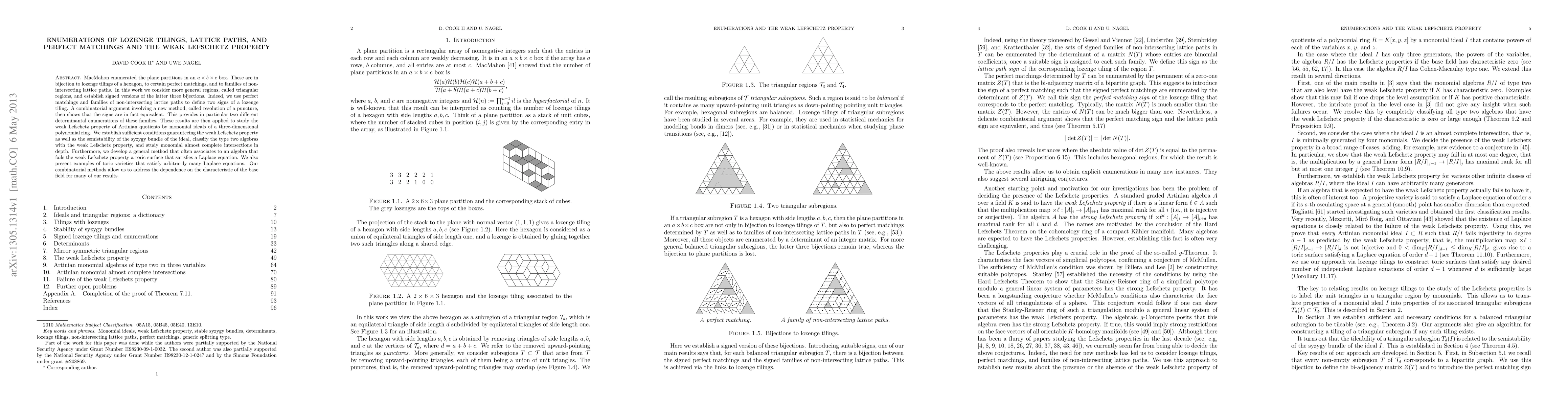MacMahon enumerated the plane partitions in an $a \times b \times c$ box. These are in bijection to lozenge tilings of a hexagon, to certain perfect matchings, and to families of non-intersecting lattice paths. In this work we consider more general regions, called triangular regions, and establish signed versions of the latter three bijections. Indeed, we use perfect matchings and families of non-intersecting lattice paths to define two signs of a lozenge tiling. A combinatorial argument involving a new method, called resolution of a puncture, then shows that the signs are in fact equivalent. This provides in particular two different determinantal enumerations of these families. These results are then applied to study the weak Lefschetz property of Artinian quotients by monomial ideals of a three-dimensional polynomial ring. We establish sufficient conditions guaranteeing the weak Lefschetz property as well as the semistability of the syzygy bundle of the ideal, classify the type two algebras with the weak Lefschetz property, and study monomial almost complete intersections in depth. Furthermore, we develop a general method that often associates to an algebra that fails the weak Lefschetz property a toric surface that satisfies a Laplace equation. We also present examples of toric varieties that satisfy arbitrarily many Laplace equations. Our combinatorial methods allow us to address the dependence on the characteristic of the base field for many of our results.
