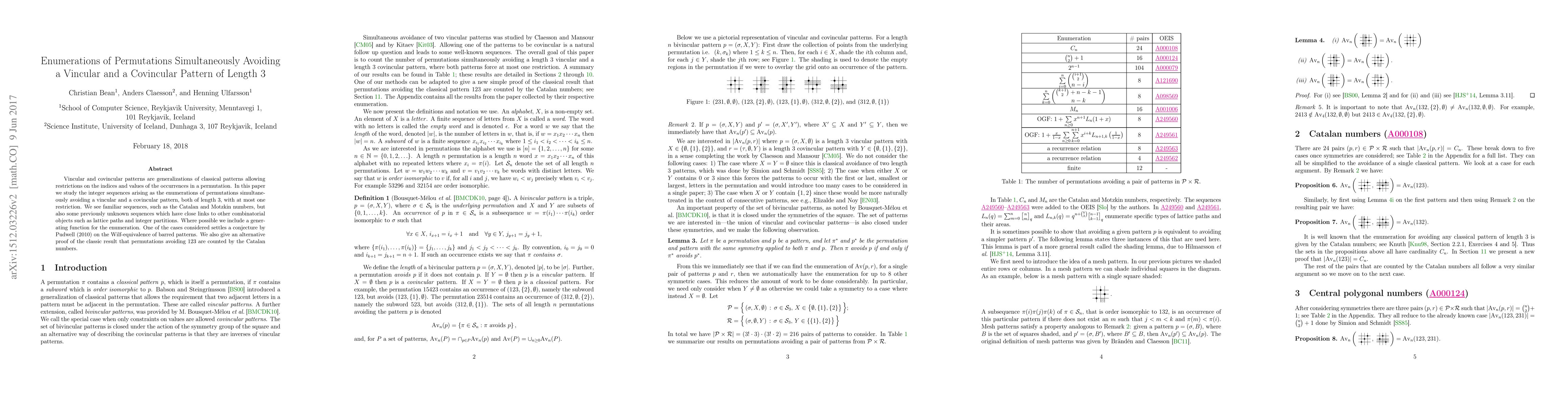 This paper enumerates permutations that avoid both a vincular and covincular pattern of length 3, revealing new sequences tied to combinatorial objects and resolving Pudwell's conjecture on Wilf-equivalence, while also proving the Catalan number count for permutations avoiding 123.