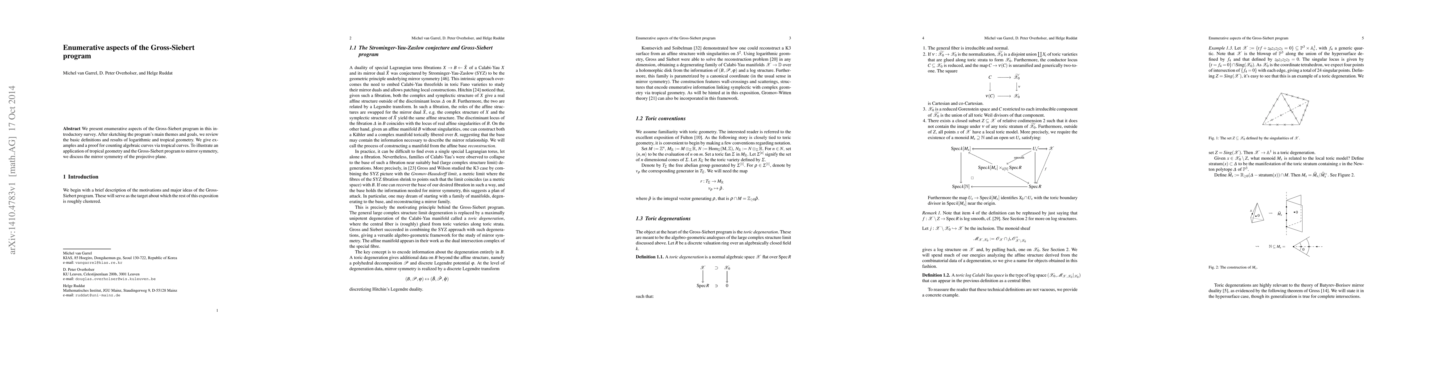 We present enumerative aspects of the Gross-Siebert program in this introductory survey. After sketching the program's main themes and goals, we review the basic definitions and results of logarithmic and tropical geometry. We give examples and a proof for counting algebraic curves via tropical curves. To illustrate an application of tropical geometry and the Gross-Siebert program to mirror symmetry, we discuss the mirror symmetry of the projective plane.