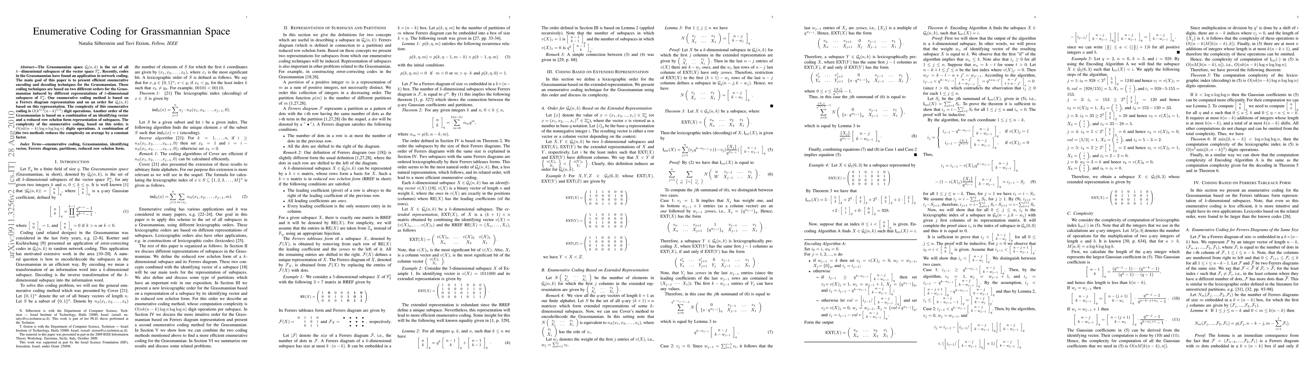 This paper presents efficient enumerative coding techniques for Grassmannian space, focusing on two methods: one based on Ferrers diagram representation with a complexity of $O(k^{5/2} (n-k)^{5/2})$, and another using a combination of identifying vector and reduced row echelon form with a complexity of $O(nk(n-k)\log n\log\log n)$. Combining both methods reduces complexity on average.
