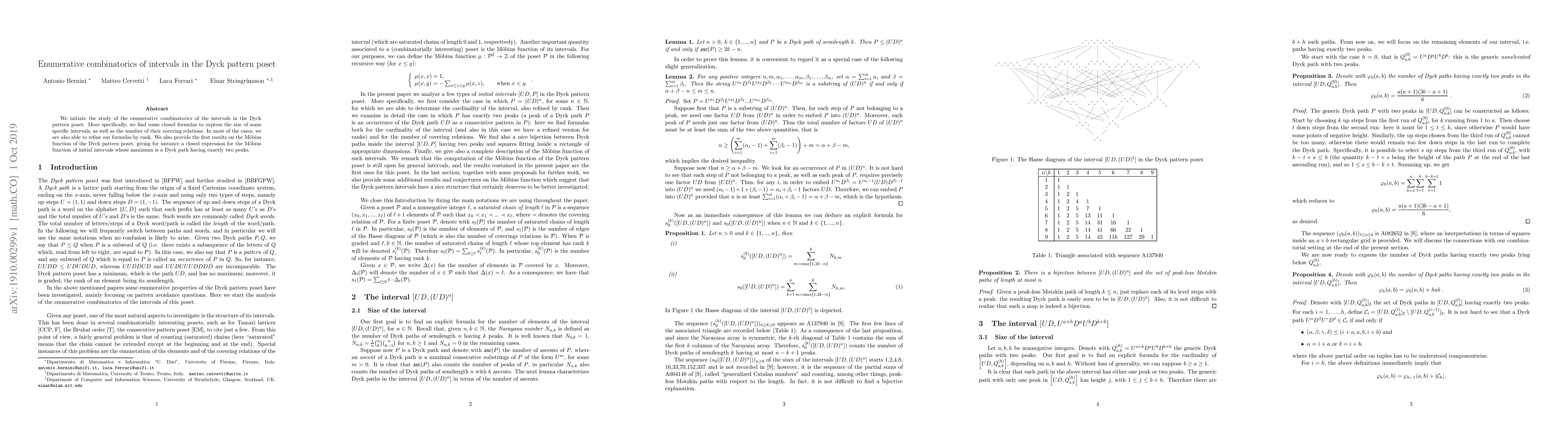 This paper explores the enumerative combinatorics of intervals in the Dyck pattern poset, deriving closed formulas for the size of specific intervals and their covering relations, and refining these results by rank. It also presents the first findings on the M\"obius function, including a closed expression for initial intervals with a Dyck path of exactly two peaks.
