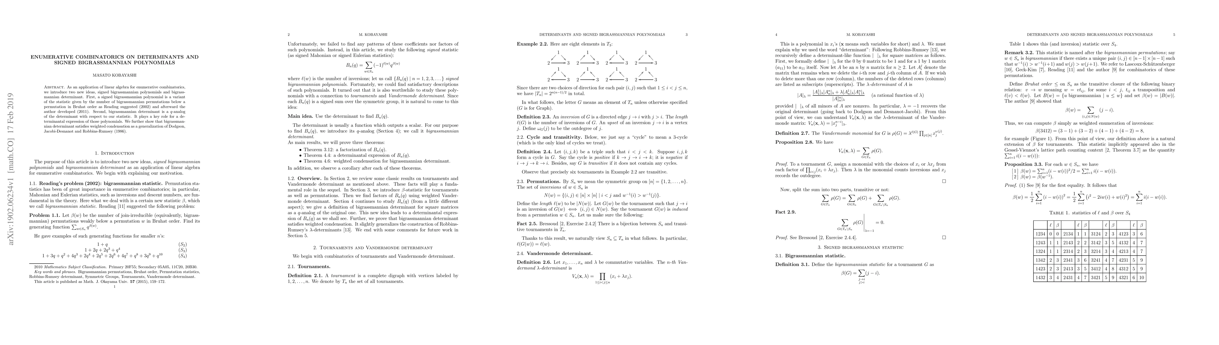 This paper introduces signed bigrassmannian polynomials and bigrassmannian determinant, using linear algebra to solve problems in enumerative combinatorics, with potential applications in understanding permutations and group structures.