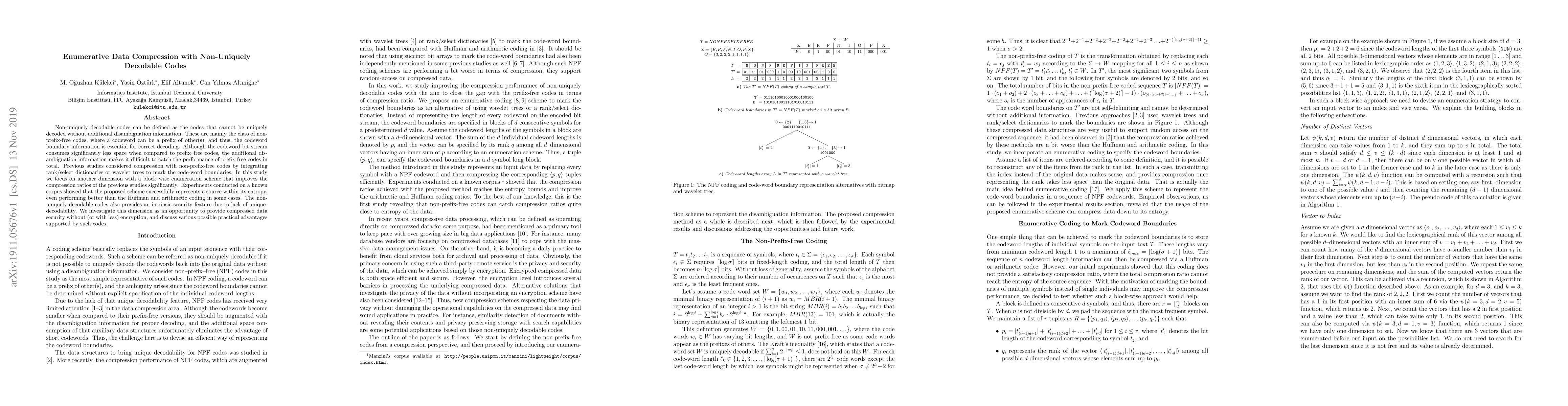 Non-uniquely decodable codes can be defined as the codes that cannot be uniquely decoded without additional disambiguation information. These are mainly the class of non-prefix-free codes, where a codeword can be a prefix of other(s), and thus, the codeword boundary information is essential for correct decoding. Although the codeword bit stream consumes significantly less space when compared to prefix--free codes, the additional disambiguation information makes it difficult to catch the performance of prefix-free codes in total. Previous studies considered compression with non-prefix-free codes by integrating rank/select dictionaries or wavelet trees to mark the code-word boundaries. In this study we focus on another dimension with a block--wise enumeration scheme that improves the compression ratios of the previous studies significantly. Experiments conducted on a known corpus showed that the proposed scheme successfully represents a source within its entropy, even performing better than the Huffman and arithmetic coding in some cases. The non-uniquely decodable codes also provides an intrinsic security feature due to lack of unique-decodability. We investigate this dimension as an opportunity to provide compressed data security without (or with less) encryption, and discuss various possible practical advantages supported by such codes.
