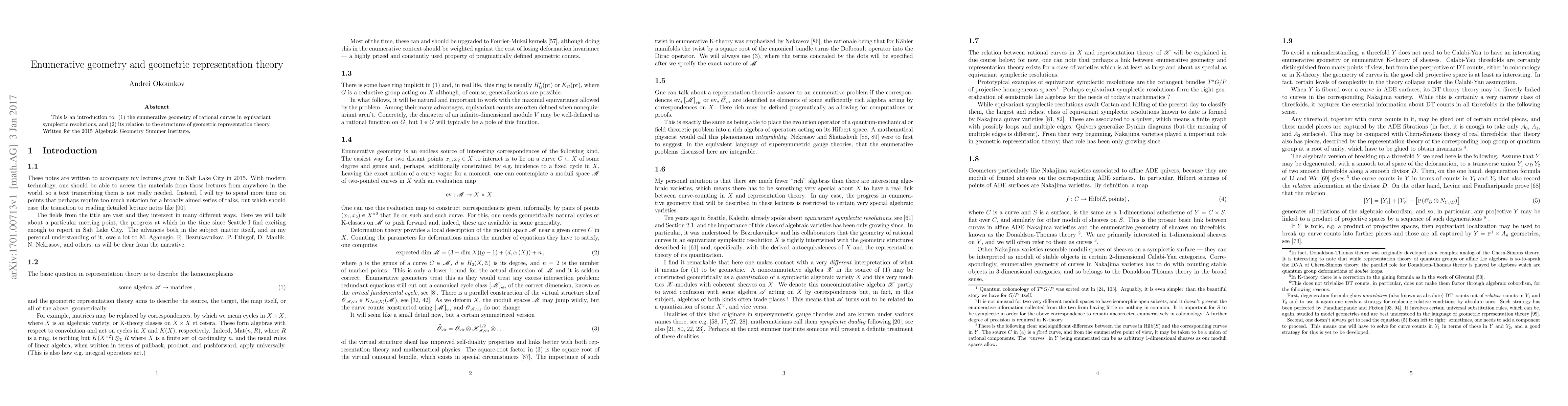 This paper introduces enumerative geometry focusing on rational curves in equivariant symplectic resolutions and explores their connections to geometric representation theory, written for the 2015 Algebraic Geometry Summer Institute.