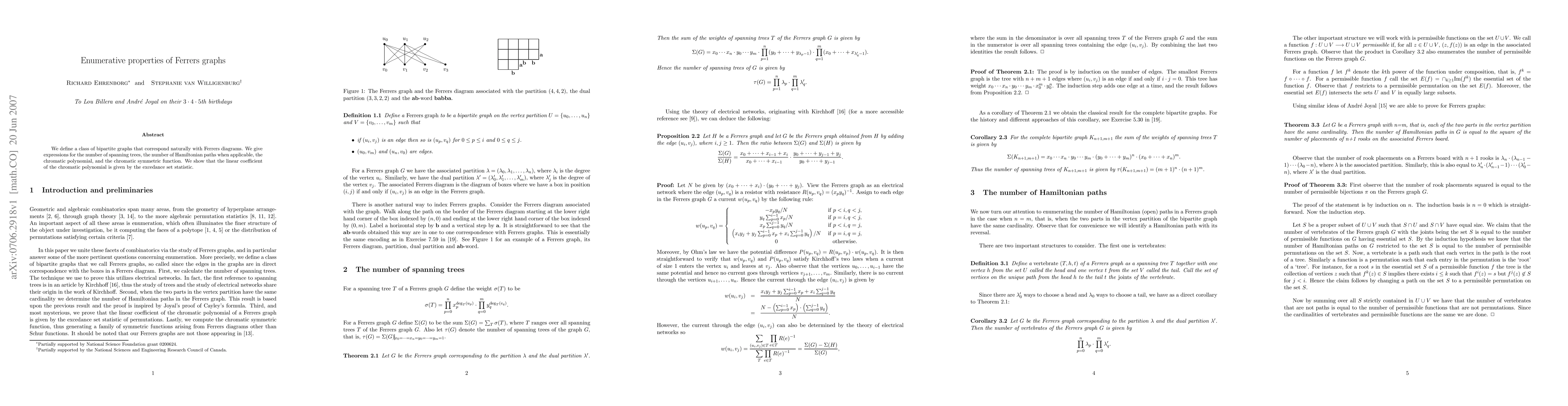 A study defines a connection between Ferrers diagrams and bipartite graphs, providing expressions for various graph properties like spanning trees, Hamiltonian paths, chromatic polynomial, and chromatic symmetric function. The linear coefficient of the chromatic polynomial is shown to be related to the excedance set statistic.