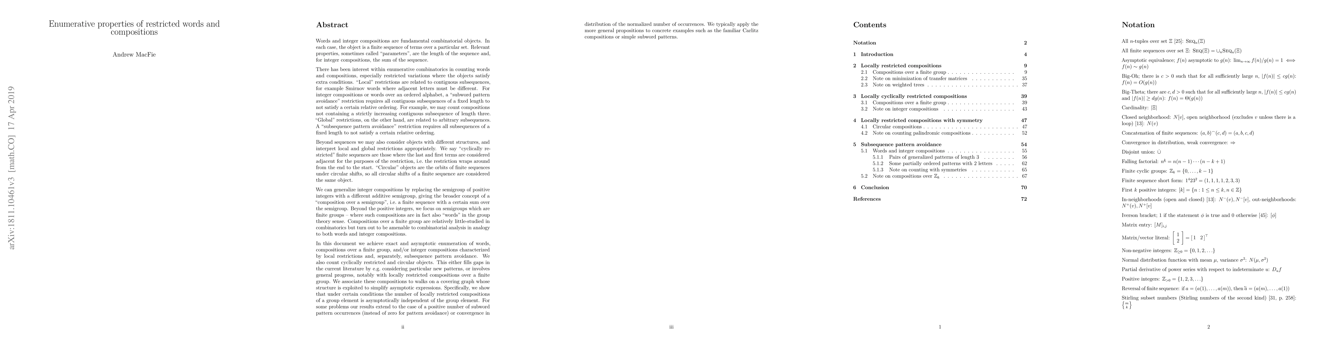In this document we achieve exact and asymptotic enumeration of words, compositions over a finite group, and/or integer compositions characterized by local restrictions and, separately, subsequence pattern avoidance. We also count cyclically restricted and circular objects. This either fills gaps in the current literature by e.g. considering particular new patterns, or involves general progress, notably with locally restricted compositions over a finite group. We associate these compositions to walks on a covering graph whose structure is exploited to simplify asymptotic expressions. Specifically, we show that under certain conditions the number of locally restricted compositions of a group element is asymptotically independent of the group element. For some problems our results extend to the case of a positive number of subword pattern occurrences (instead of zero for pattern avoidance) or convergence in distribution of the normalized number of occurrences. We typically apply the more general propositions to concrete examples such as the familiar Carlitz compositions or simple subword patterns.