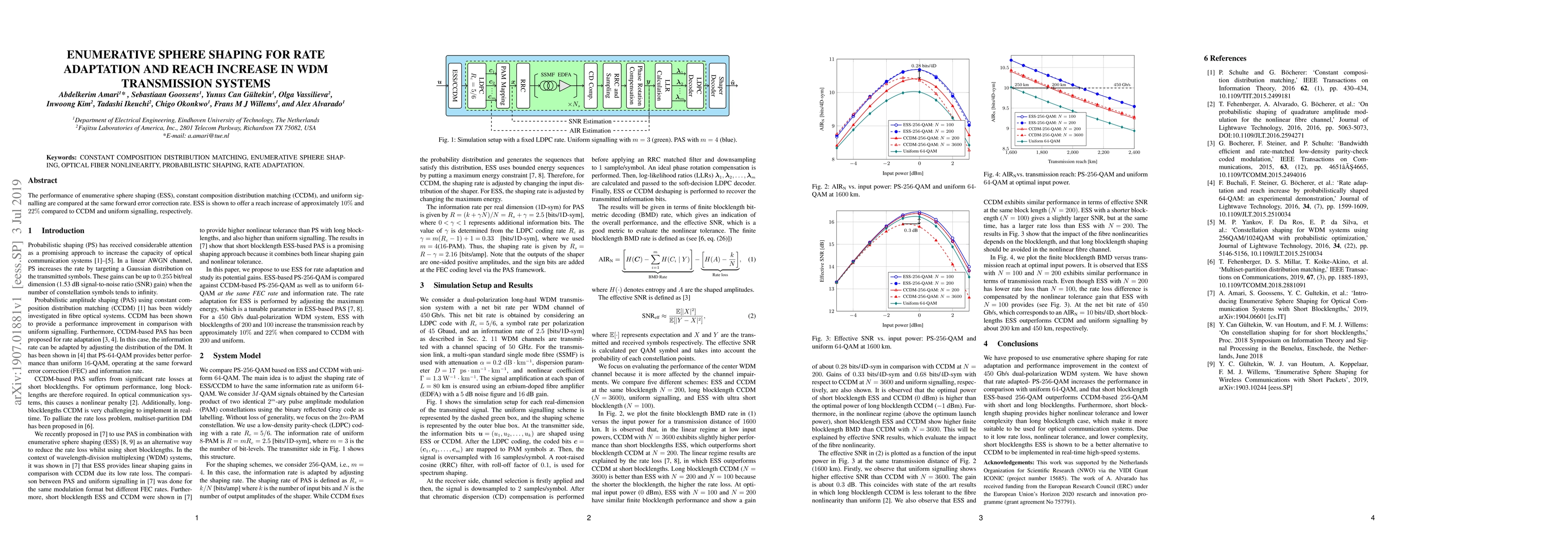 This paper compares enumerative sphere shaping (ESS), constant composition distribution matching (CCDM), and uniform signalling in WDM transmission systems, finding that ESS achieves a reach increase of about 10% over CCDM and 22% over uniform signalling while maintaining the same forward error correction rate.