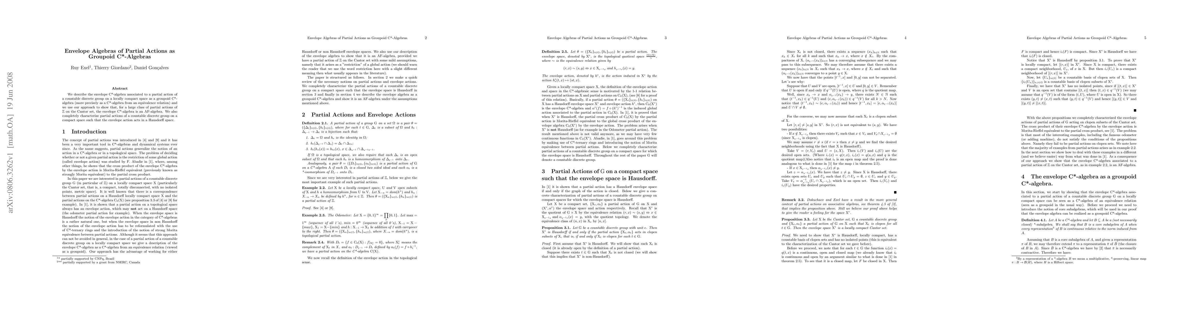 We describe the envelope C*-algebra associated to a partial action of a countable discrete group on a locally compact space as a groupoid C*-algebra (more precisely as a C*-algebra from an equivalence relation) and we use our approach to show that, for a large class of partial actions of Z on the Cantor set, the envelope C*-algebra is an AF-algebra. We also completely characterize partial actions of a countable discrete group on a compact space such that the envelope action acts in a Hausdorff space.