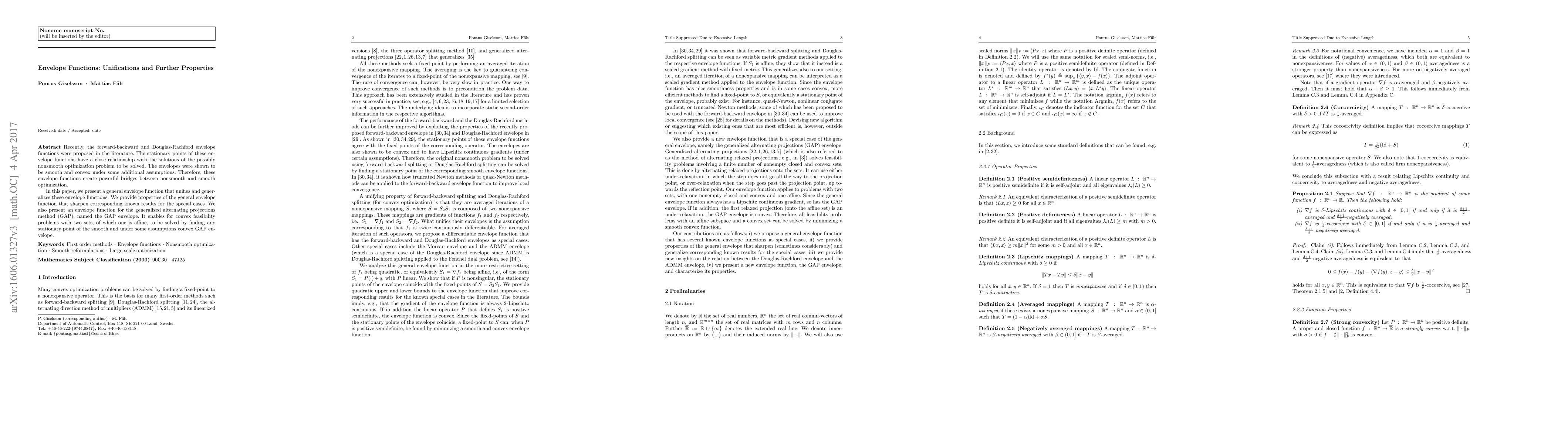 Recently, the forward-backward and Douglas-Rachford envelope functions were proposed in the literature. The stationary points of these envelope functions have a close relationship with the solutions of the possibly nonsmooth optimization problem to be solved. The envelopes were shown to be smooth and convex under some additional assumptions. Therefore, these envelope functions create powerful bridges between nonsmooth and smooth optimization. In this paper, we present a general envelope function that unifies and generalizes these envelope functions. We provide properties of the general envelope function that sharpen corresponding known results for the special cases. We also present an envelope function for the generalized alternating projections method (GAP), named the GAP envelope. It enables for convex feasibility problems with two sets, of which one is affine, to be solved by finding any stationary point of the smooth and under some assumptions convex GAP envelope.