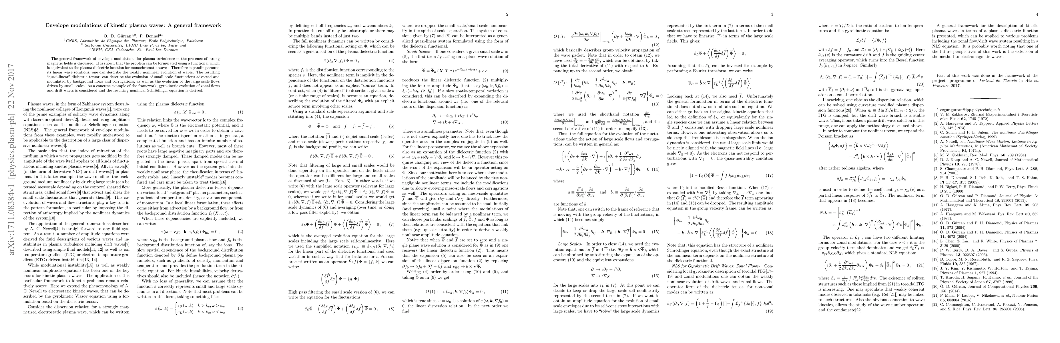 The general framework of envelope modulations for plasma turbulence in the presence of strong magnetic fields is discussed. It is shown that the problem can be formulated using a functional which is equivalent to the plasma dielectric function for monochromatic waves. Therefore expanding around its linear wave solutions, one can describe the weakly nonlinear evolution of waves. The resulting "quasi-linear" dielectric tensor, can describe the evolution of small scale fluctuations advected and modulated by background flows and corrugations, as well as the evolution of the large scale flows driven by small scales. As a concrete example of the framework, gyrokinetic evolution of zonal flows and drift waves is considered and the resulting nonlinear Schr\"odinger equation is derived.