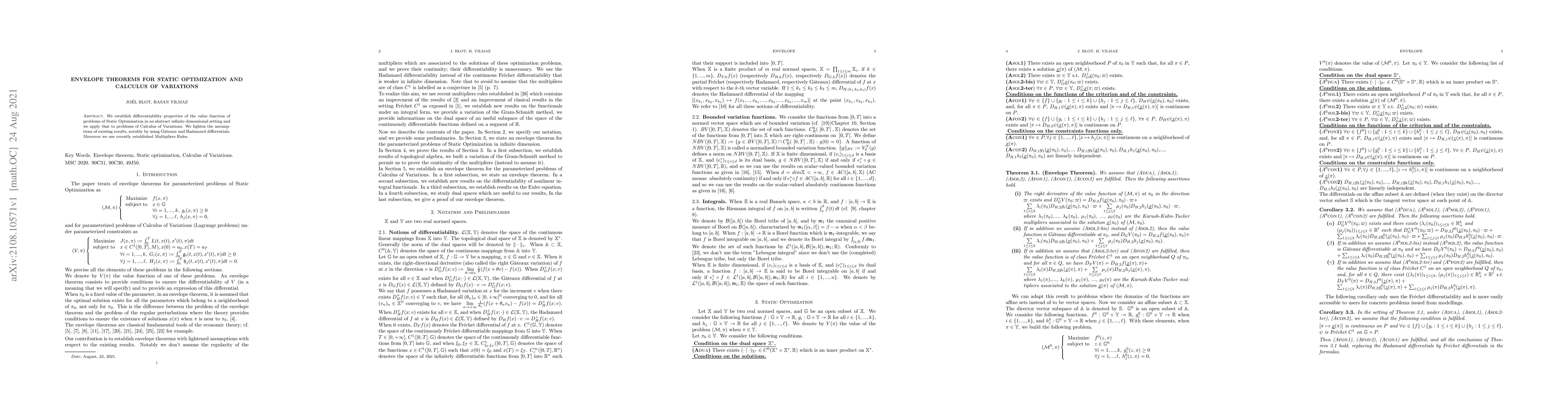 We establish differentiability properties of the value function of problems of Static Optimization in an abstract infinite dimensional setting and we apply that to problems of Calculus of Variations. We lighten the assumptions of existing results, notably by using G{\^a}teaux and Hadamard differentials. Moreover we use recently established Multipliers Rules.