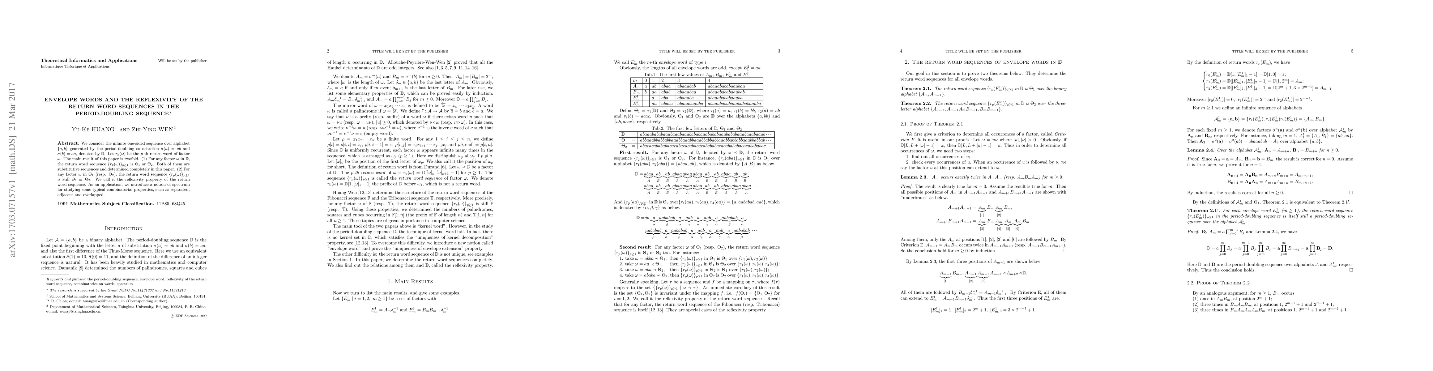 We consider the infinite one-sided sequence over alphabet $\{a,b\}$ generated by the period-doubling substitution $\sigma(a)=ab$ and $\sigma(b)=aa$, denoted by $\mathbb{D}$. Let $r_p(\omega)$ be the $p$-th return word of factor $\omega$. The main result of this paper is twofold. (1) For any factor $\omega$ in $\mathbb{D}$, the return word sequence $\{r_p(\omega)\}_{p\geq1}$ is $\Theta_1$ or $\Theta_2$. Both of them are substitutive sequences and determined completely in this paper. (2) For any factor $\omega$ in $\Theta_1$ (resp. $\Theta_2$), the return word sequence $\{r_p(\omega)\}_{p\geq1}$ is still $\Theta_1$ or $\Theta_2$. We call it the reflexivity property of the return word sequence. As an application, we introduce a notion of spectrum for studying some typical combinatorial properties, such as separated, adjacent and overlapped.