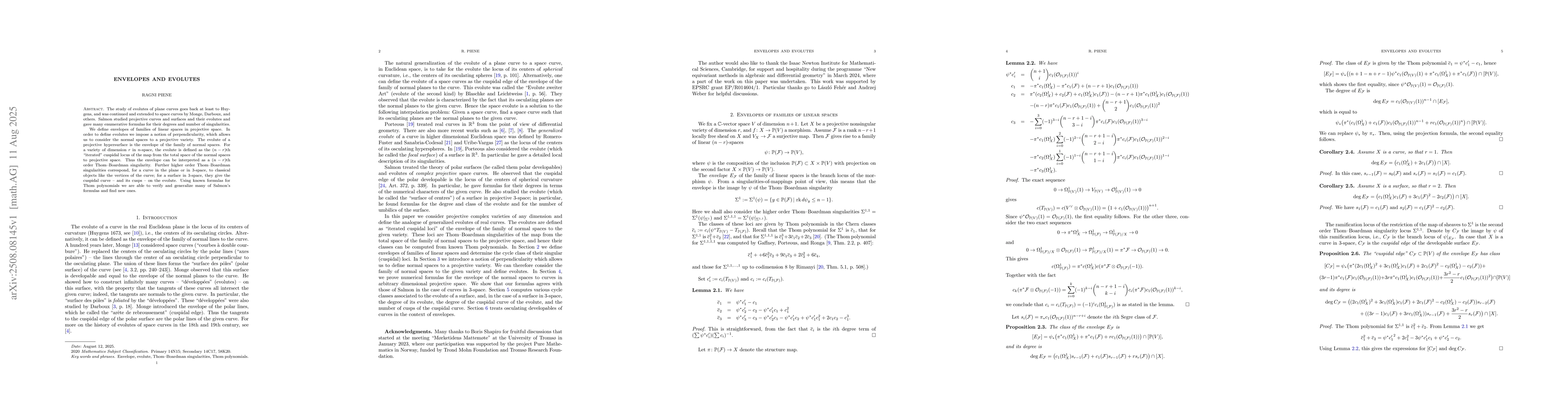 The study of evolutes of plane curves goes back at least to Huygens, and was continued and extended to space curves by Monge, Darboux, and others. Salmon studied projective curves and surfaces and their evolutes and gave many enumerative formulas for their degrees and number of singularities. We define envelopes of families of linear spaces in projective space. In order to define evolutes we impose a notion of perpendicularity, which allows us to consider the normal spaces to a projective variety. The evolute of a projective hypersurface is the envelope of the family of normal spaces. For a variety of dimension $r$ in $n$-space, the evolute is defined as the $(n-r)$th iterated cuspidal locus of the map from the total space of the normal spaces to projective space. Thus the envelope can be interpreted as a $(n-r)$th order Thom-Boardman singularity. Further higher order Thom-Boardman singularities correspond, for a curve in the plane or in 3-space, to classical objects like the vertices of the curve; for a surface in 3-space, they give the cuspidal curve - and its cusps - on the evolute. Using known formulas for Thom polynomials we are able to verify and generalize many of Salmon's formulas and find new ones.