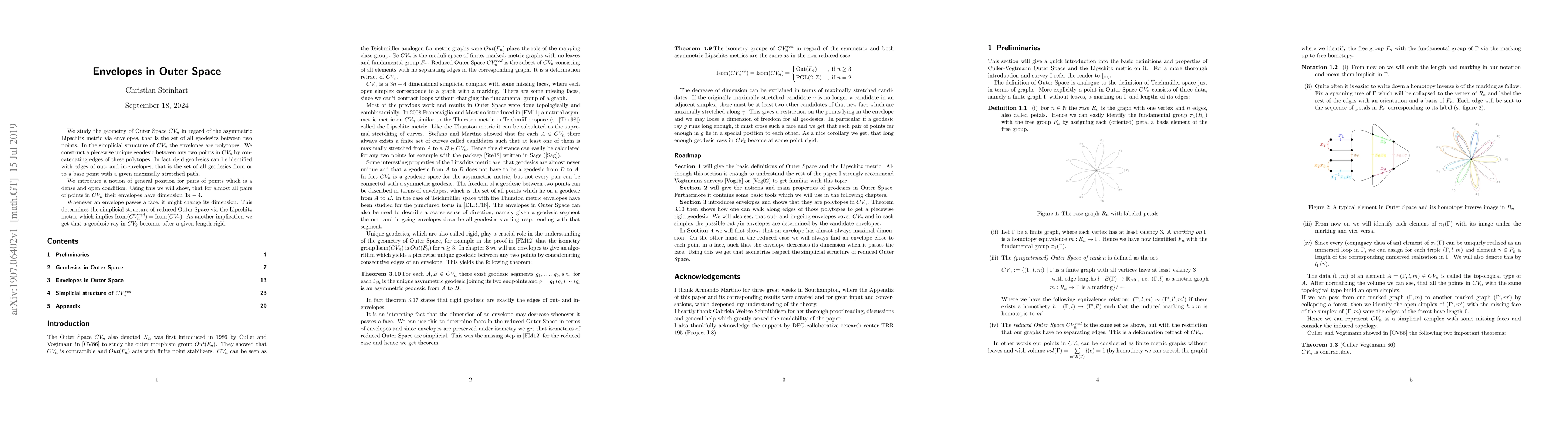 The paper studies the geometry of Outer Space $CV_n$ using envelopes, finding that for almost all pairs of points, their envelopes have dimension $3n-4$, and this structure determines the simplicial structure of reduced Outer Space.