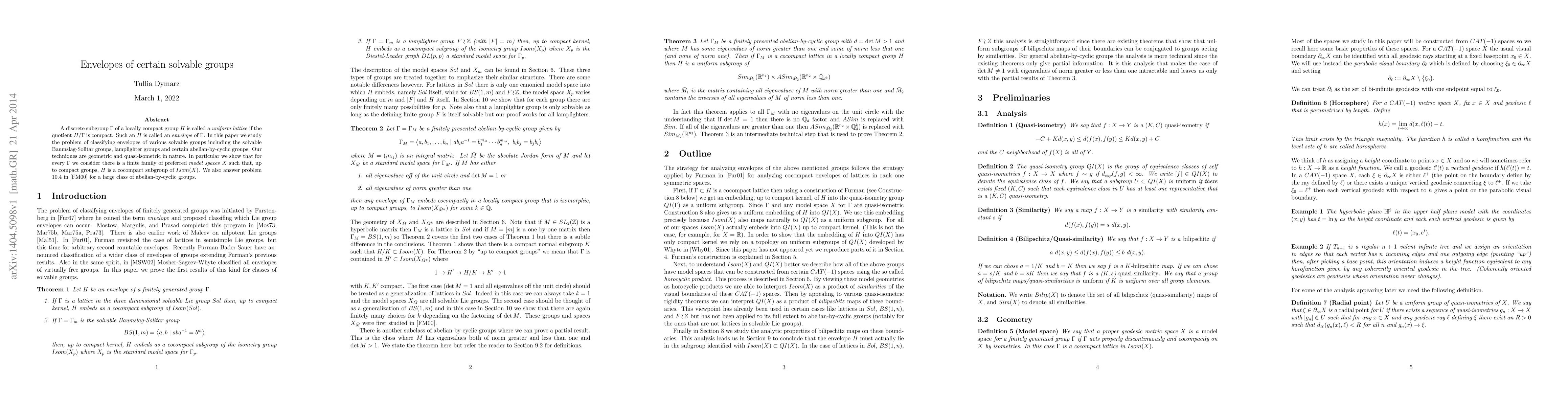 This paper classifies the envelopes of various solvable groups, including Baumslag-Solitar, lamplighter, and abelian-by-cyclic groups, using geometric and quasi-isometric techniques, showing that each group's envelope is cocompact in the isometry group of a finite family of model spaces.