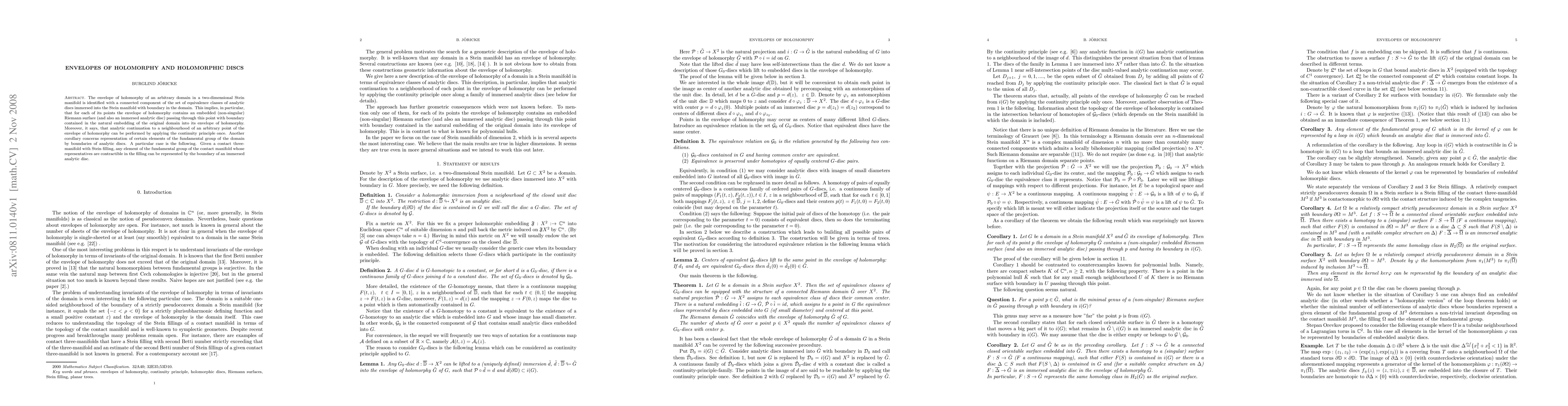 This paper identifies the envelope of holomorphy of a domain in a two-dimensional Stein manifold as a connected component of equivalence classes of analytic discs, asserting the presence of embedded Riemann surfaces and the possibility of a single analytic continuation via the continuity principle. It also shows that fundamental group elements of a contact manifold with Stein filling can be represented by the boundary of immersed analytic discs.