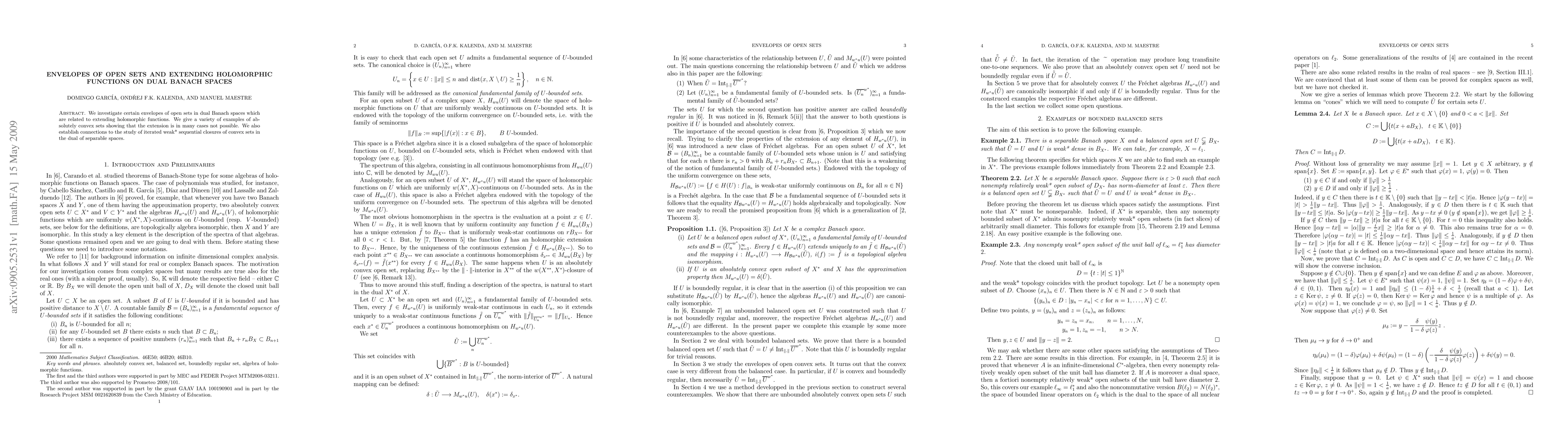 This paper explores envelopes of open sets in dual Banach spaces concerning the extension of holomorphic functions, providing examples of absolutely convex sets where such extensions fail. It also connects these findings to the study of iterated weak* sequential closures of convex sets in the dual of separable spaces.