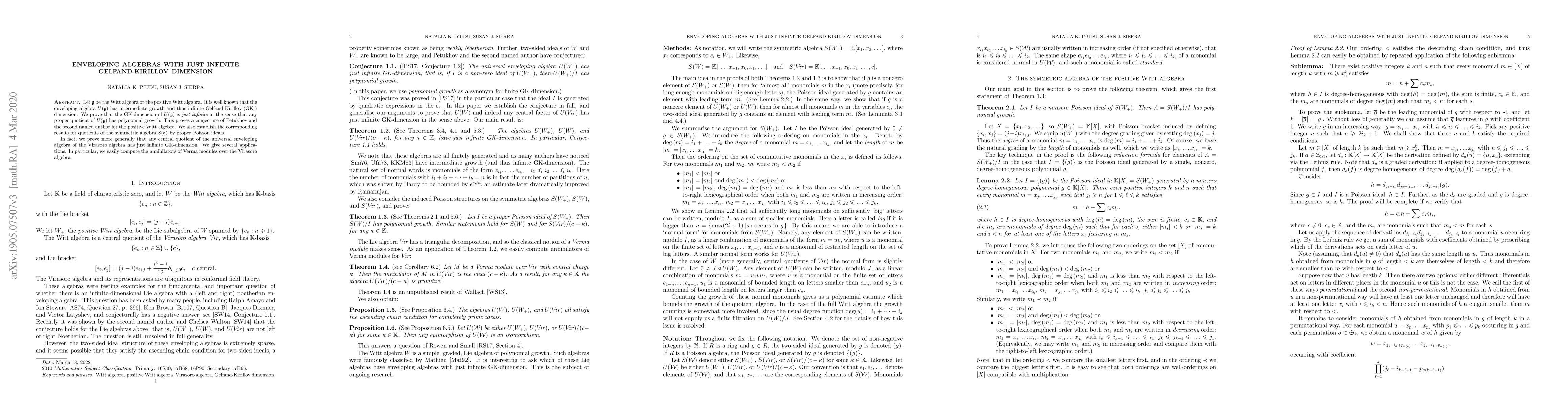 Let $\mf g$ be the Witt algebra or the positive Witt algebra. It is well known that the enveloping algebra $U(\mf g )$ has intermediate growth and thus infinite Gelfand-Kirillov (GK-) dimension. We prove that the GK-dimension of $U(\mf g)$ is {\em just infinite} in the sense that any proper quotient of $U(\mf g)$ has polynomial growth. This proves a conjecture of Petukhov and the second named author for the positive Witt algebra. We also establish the corresponding results for quotients of the symmetric algebra $S(\mf g)$ by proper Poisson ideals. In fact, we prove more generally that any central quotient of the universal enveloping algebra of the Virasoro algebra has just infinite GK-dimension. We give several applications. In particular, we easily compute the annihilators of Verma modules over the Virasoro algebra.