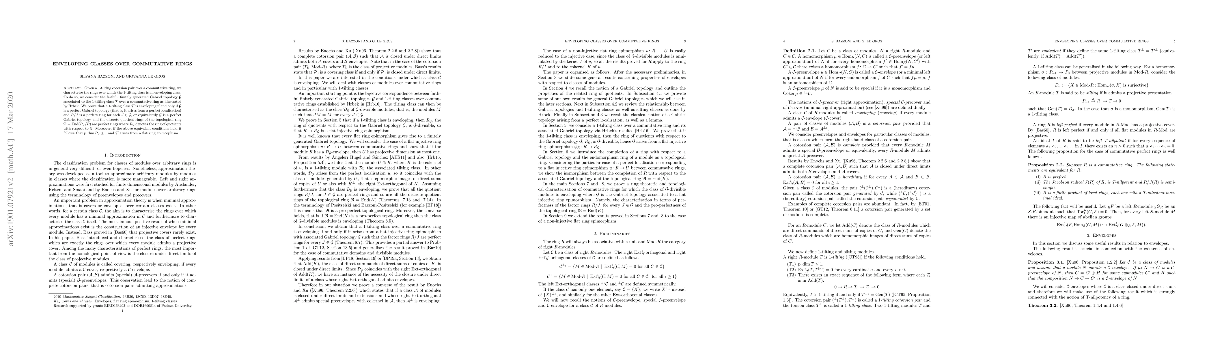 This paper characterizes commutative rings where a $1$-tilting class is an enveloping class, proving that it occurs if the associated Gabriel topology is perfect and the quotient rings by the topology elements are perfect, leading to a projective dimension of at most 1 and the tilting class originating from a flat ring epimorphism.