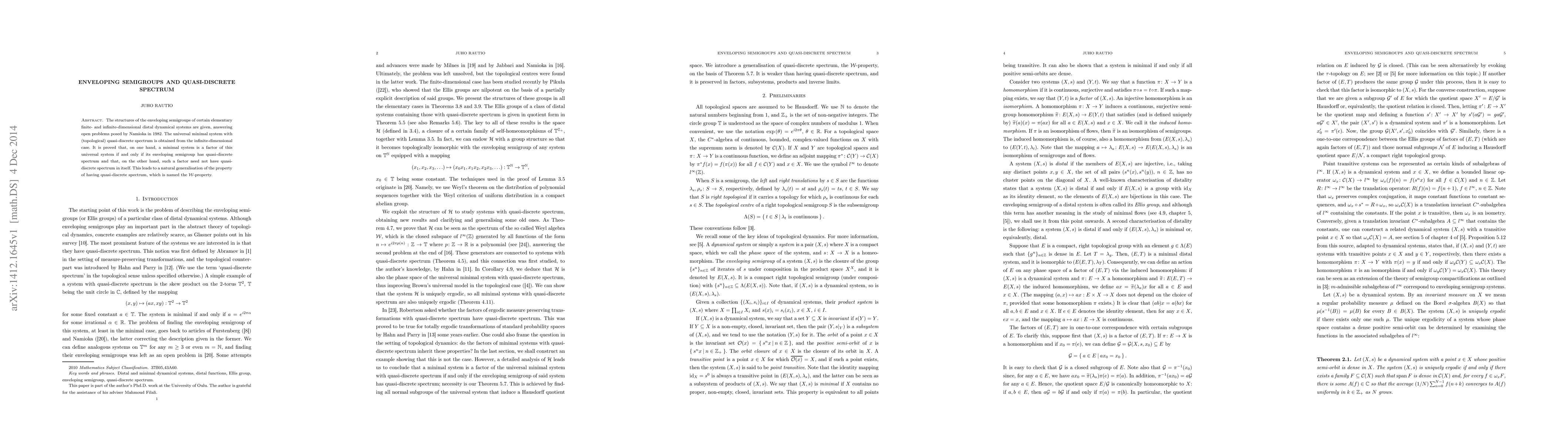 The paper investigates the structure of enveloping semigroups in distal dynamical systems and resolves Namioka's 1982 open problems. It introduces a universal minimal system with quasi-discrete spectrum and defines the $\mathcal{W}$-property, showing that while a minimal system can factor into this universal system if its enveloping semigroup has quasi-discrete spectrum, the factor itself may not retain this property.