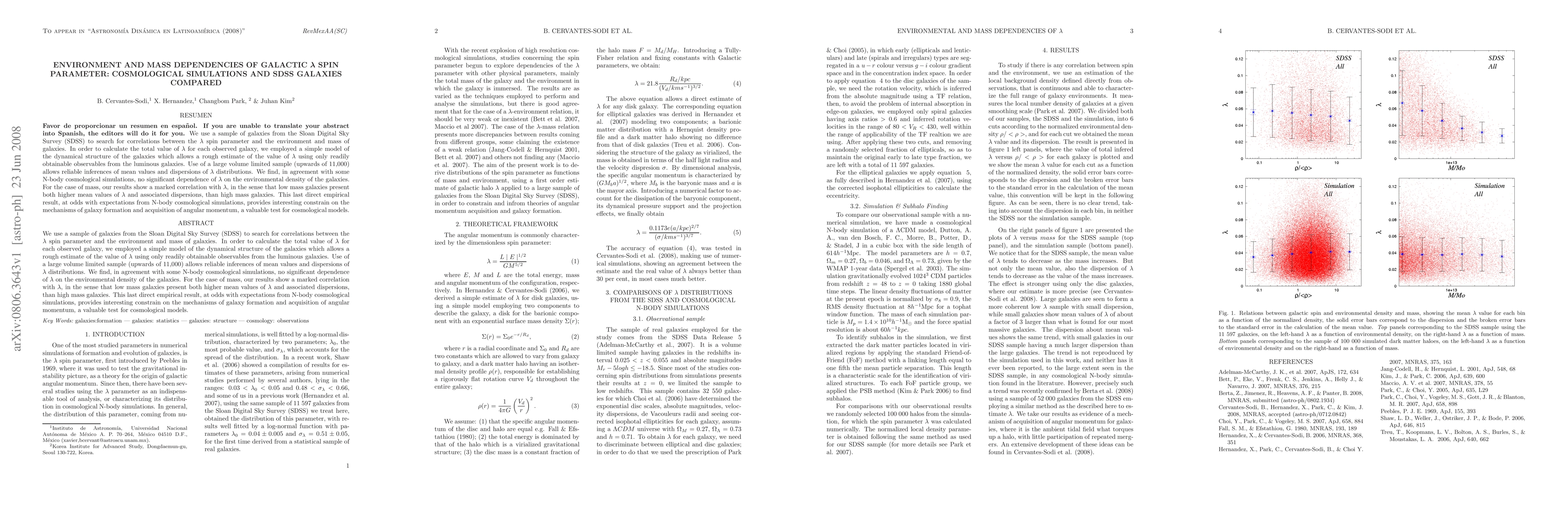 We use a sample of galaxies from the Sloan Digital Sky Survey (SDSS) to search for correlations between the $\lambda$ spin parameter and the environment and mass of galaxies. In order to calculate the total value of $\lambda$ for each observed galaxy, we employed a simple model of the dynamical structure of the galaxies which allows a rough estimate of the value of $\lambda$ using only readily obtainable observables from the luminous galaxies. Use of a large volume limited sample (upwards of 11,000) allows reliable inferences of mean values and dispersions of $\lambda$ distributions. We find, in agreement with some N-body cosmological simulations, no significant dependence of $\lambda$ on the environmental density of the galaxies. For the case of mass, our results show a marked correlation with $\lambda$, in the sense that low mass galaxies present both higher mean values of $\lambda$ and associated dispersions, than high mass galaxies. This last direct empirical result, at odds with expectations from N-body cosmological simulations, provides interesting constrain on the mechanisms of galaxy formation and acquisition of angular momentum, a valuable test for cosmological models.