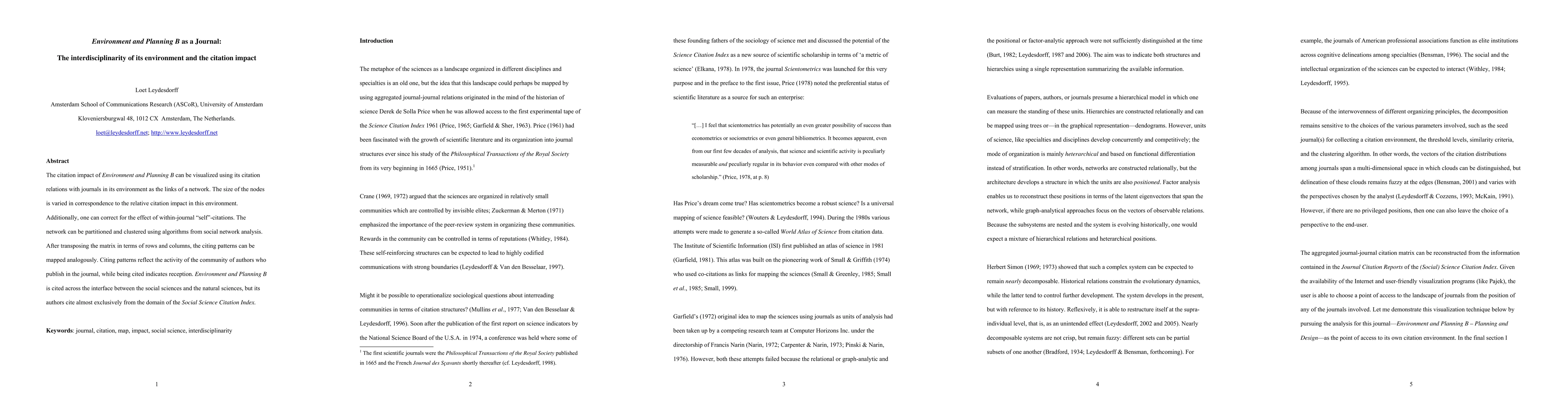 The citation impact of Environment and Planning B can be visualized using its citation relations with journals in its environment as the links of a network. The size of the nodes is varied in correspondence to the relative citation impact in this environment. Additionally, one can correct for the effect of within-journal "self"-citations. The network can be partitioned and clustered using algorithms from social network analysis. After transposing the matrix in terms of rows and columns, the citing patterns can be mapped analogously. Citing patterns reflect the activity of the community of authors who publish in the journal, while being cited indicates reception. Environment and Planning B is cited across the interface between the social sciences and the natural sciences, but its authors cite almost exclusively from the domain of the Social Science Citation Index.