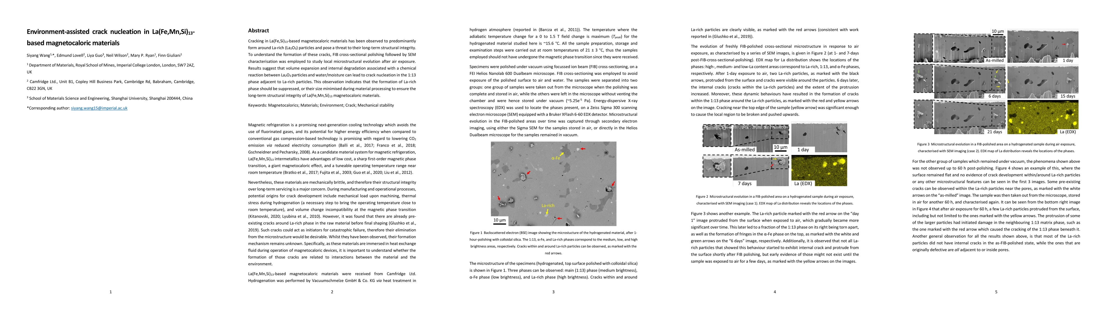 Cracking in La(Fe,Mn,Si)13 materials forms around La-rich particles due to chemical reactions with moisture, threatening structural integrity. Suppressing or minimizing La-rich phase formation is crucial for long-term structural integrity of magnetocaloric materials.
