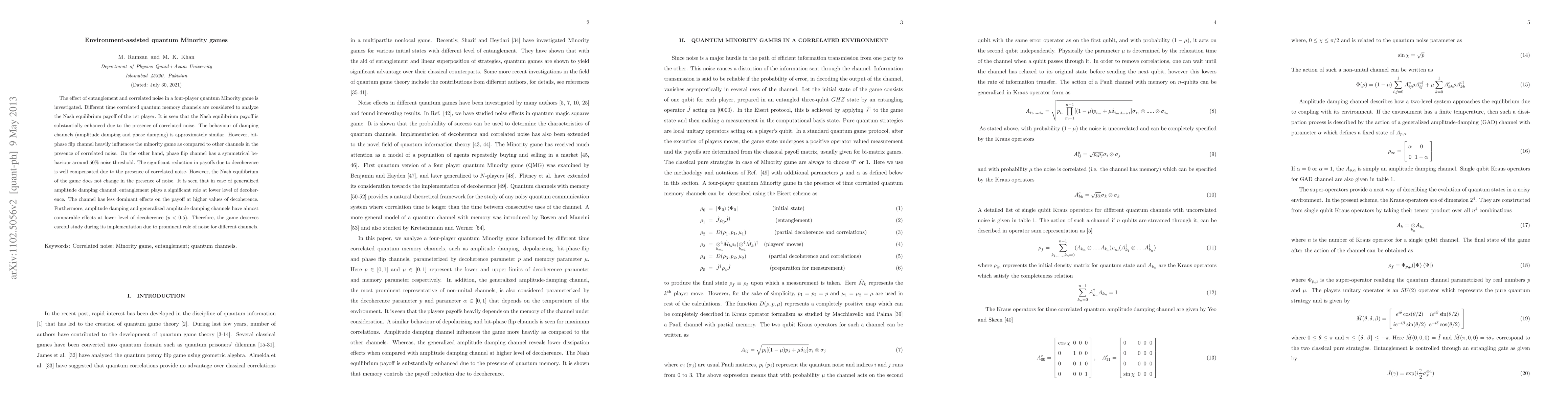 This paper examines the impact of entanglement and correlated noise on a four-player quantum Minority game, finding that correlated noise significantly enhances the Nash equilibrium payoff. Various quantum memory channels reveal that bit-phase flip channels heavily influence the game, while generalized amplitude damping channels show entanglement effects at lower decoherence levels.