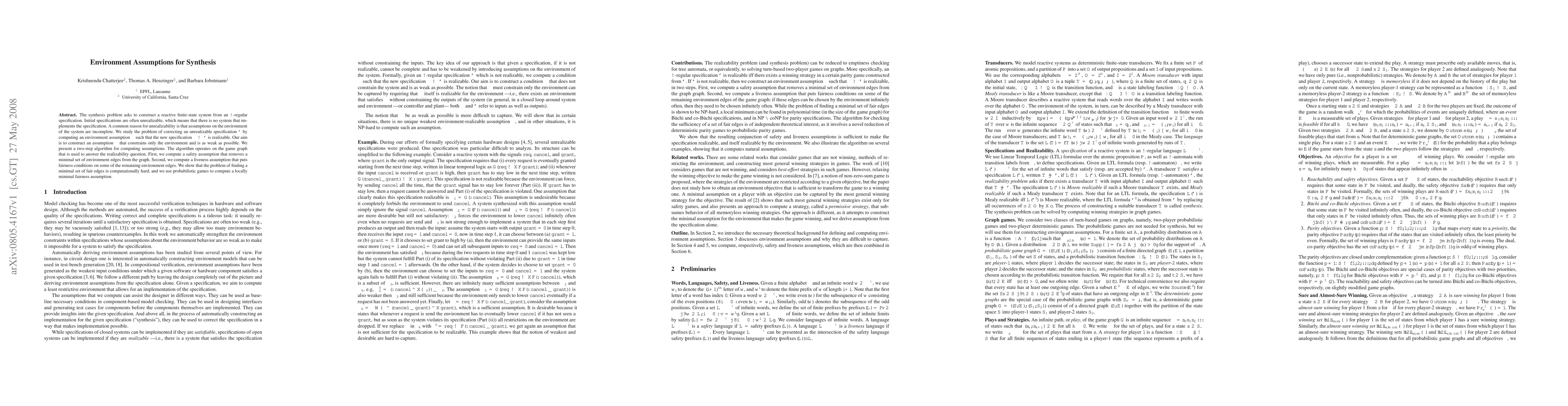 The synthesis problem asks to construct a reactive finite-state system from an $\omega$-regular specification. Initial specifications are often unrealizable, which means that there is no system that implements the specification. A common reason for unrealizability is that assumptions on the environment of the system are incomplete. We study the problem of correcting an unrealizable specification $\phi$ by computing an environment assumption $\psi$ such that the new specification $\psi\to\phi$ is realizable. Our aim is to construct an assumption $\psi$ that constrains only the environment and is as weak as possible. We present a two-step algorithm for computing assumptions. The algorithm operates on the game graph that is used to answer the realizability question. First, we compute a safety assumption that removes a minimal set of environment edges from the graph. Second, we compute a liveness assumption that puts fairness conditions on some of the remaining environment edges. We show that the problem of finding a minimal set of fair edges is computationally hard, and we use probabilistic games to compute a locally minimal fairness assumption.
