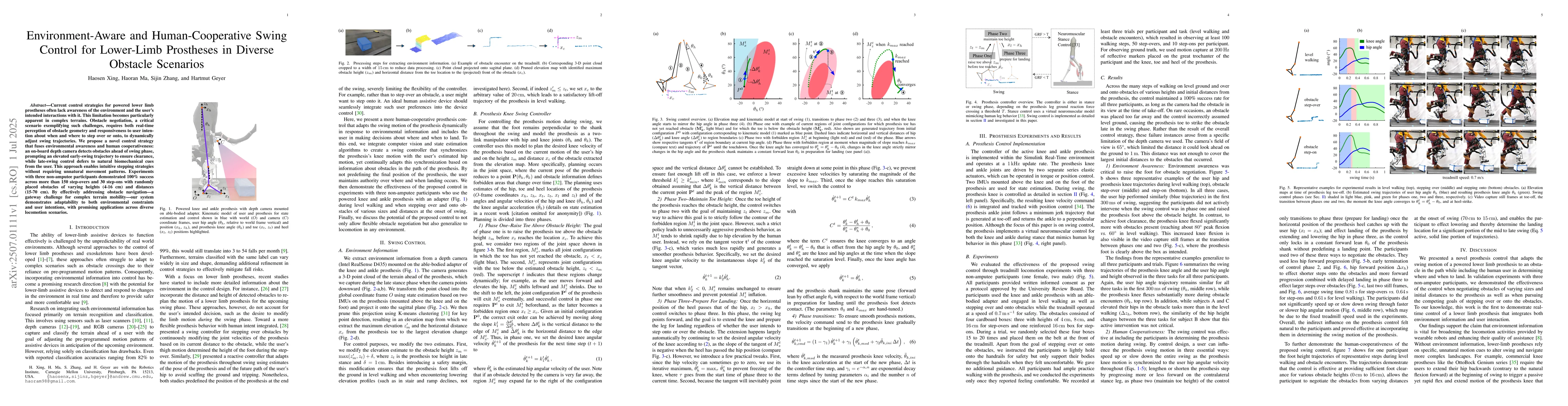 Current control strategies for powered lower limb prostheses often lack awareness of the environment and the user's intended interactions with it. This limitation becomes particularly apparent in complex terrains. Obstacle negotiation, a critical scenario exemplifying such challenges, requires both real-time perception of obstacle geometry and responsiveness to user intention about when and where to step over or onto, to dynamically adjust swing trajectories. We propose a novel control strategy that fuses environmental awareness and human cooperativeness: an on-board depth camera detects obstacles ahead of swing phase, prompting an elevated early-swing trajectory to ensure clearance, while late-swing control defers to natural biomechanical cues from the user. This approach enables intuitive stepping strategies without requiring unnatural movement patterns. Experiments with three non-amputee participants demonstrated 100 percent success across more than 150 step-overs and 30 step-ons with randomly placed obstacles of varying heights (4-16 cm) and distances (15-70 cm). By effectively addressing obstacle navigation -- a gateway challenge for complex terrain mobility -- our system demonstrates adaptability to both environmental constraints and user intentions, with promising applications across diverse locomotion scenarios.