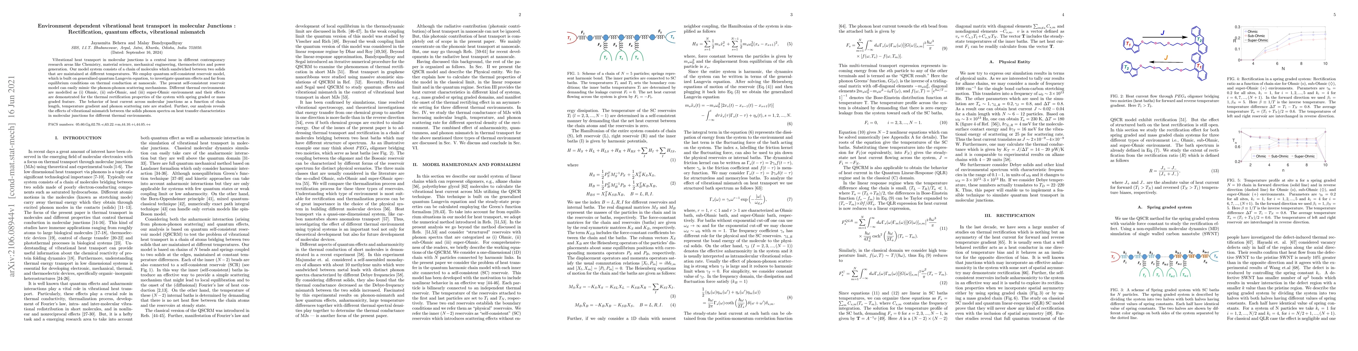 This paper investigates vibrational heat transport in molecular junctions using a quantum self-consistent reservoir model, focusing on thermal rectification, quantum effects, and phonon scattering. It examines how different thermal environments and vibrational mismatch influence heat current under various conditions.