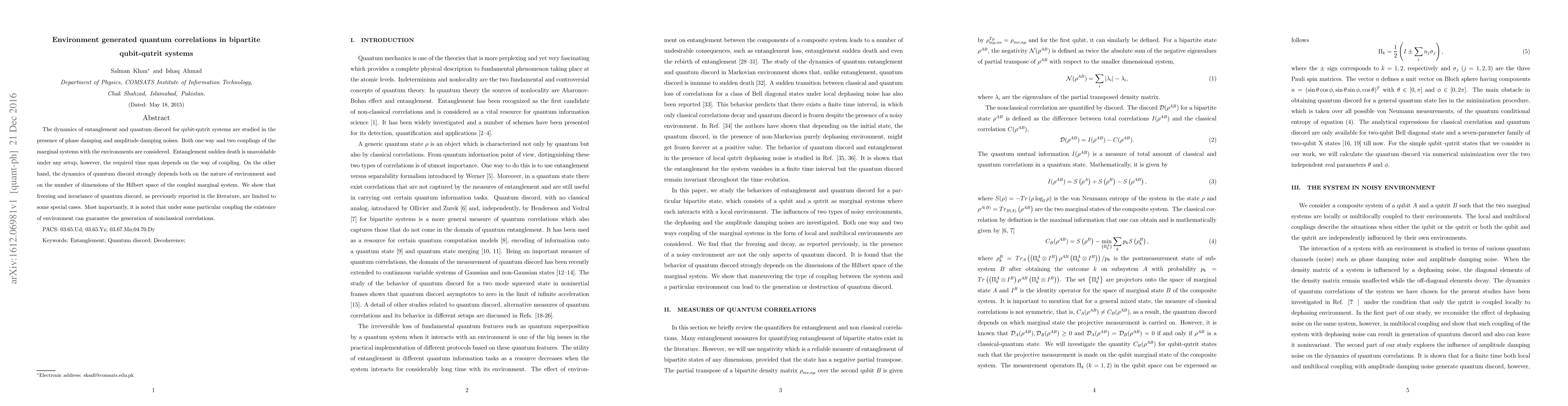 This paper investigates the dynamics of entanglement and quantum discord in bipartite qubit-qutrit systems under phase and amplitude damping noises. While entanglement always leads to sudden death, quantum discord's behavior varies with environment type and system dimensions, showing that environment coupling can generate nonclassical correlations.