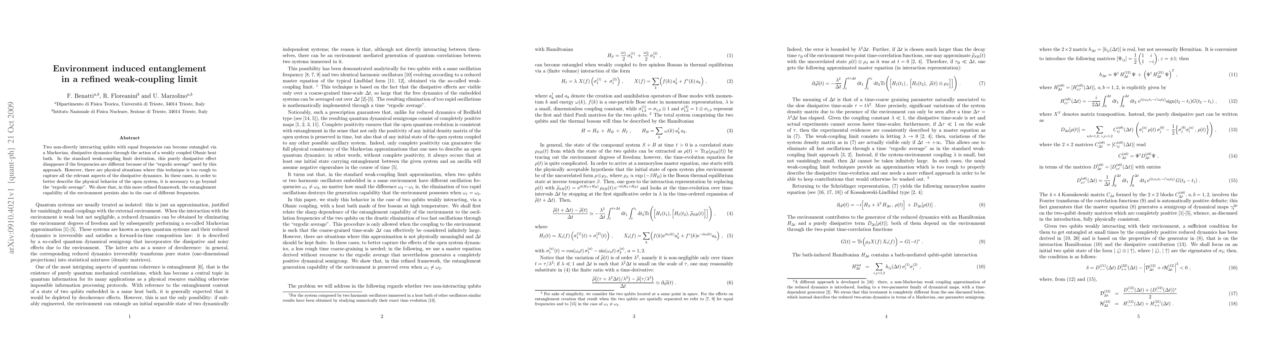 This paper demonstrates that two non-directly interacting qubits can become entangled through a weakly coupled Ohmic heat bath, even when their frequencies differ. It challenges the standard weak-coupling limit's "ergodic average" approach, showing that a more refined analysis reveals persistent entanglement capability in the environment.