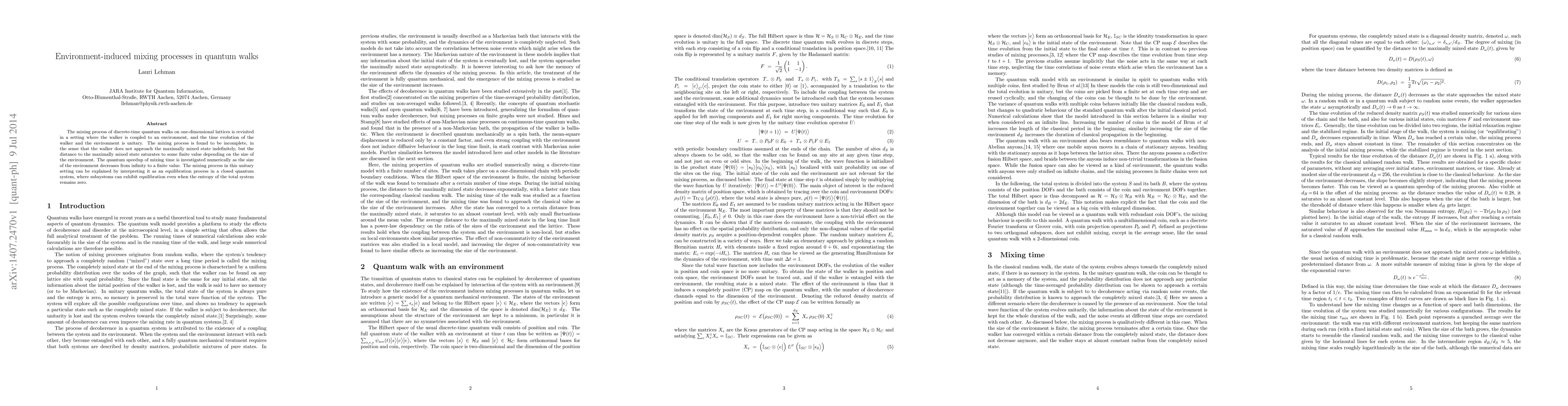 The mixing process of discrete-time quantum walks on one-dimensional lattices is revisited in a setting where the walker is coupled to an environment, and the time evolution of the walker and the environment is unitary. The mixing process is found to be incomplete, in the sense that the walker does not approach the maximally mixed state indefinitely, but the distance to the maximally mixed state saturates to some finite value depending on the size of the environment. The quantum speedup of mixing time is investigated numerically as the size of the environment decreases from infinity to a finite value. The mixing process in this unitary setting can be explained by interpreting it as an equilibration process in a closed quantum system, where subsystems can exhibit equilibration even when the entropy of the total system remains zero.