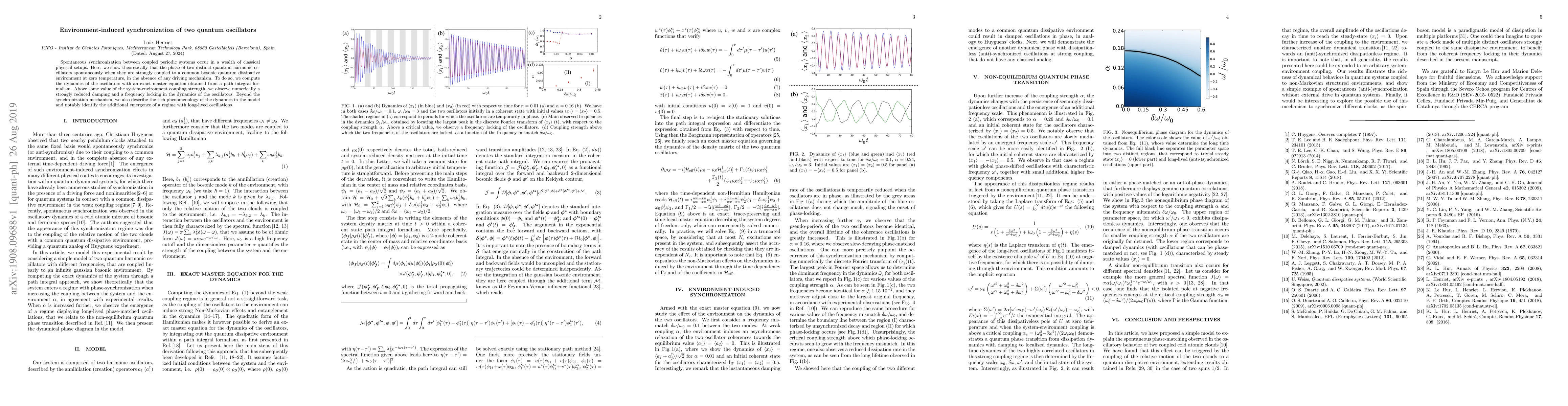 Spontaneous synchronization between coupled periodic systems occur in a wealth of classical physical setups. Here, we show theoretically that the phase of two distinct quantum harmonic oscillators spontaneously when they are strongly coupled to a common bosonic quantum dissipative environment at zero temperature, in the absence of any driving mechanism. To do so, we compute the dynamics of the oscillators with an exact master equation obtained from a path integral formalism. Above some value of the system-environment coupling strength, we observe numerically a strongly reduced damping and a frequency locking in the dynamics of the oscillators. Beyond the synchronization mechanism, we also describe the rich phenomenology of the dynamics in the model and notably identify the additional emergence of a regime with long-lived oscillations.