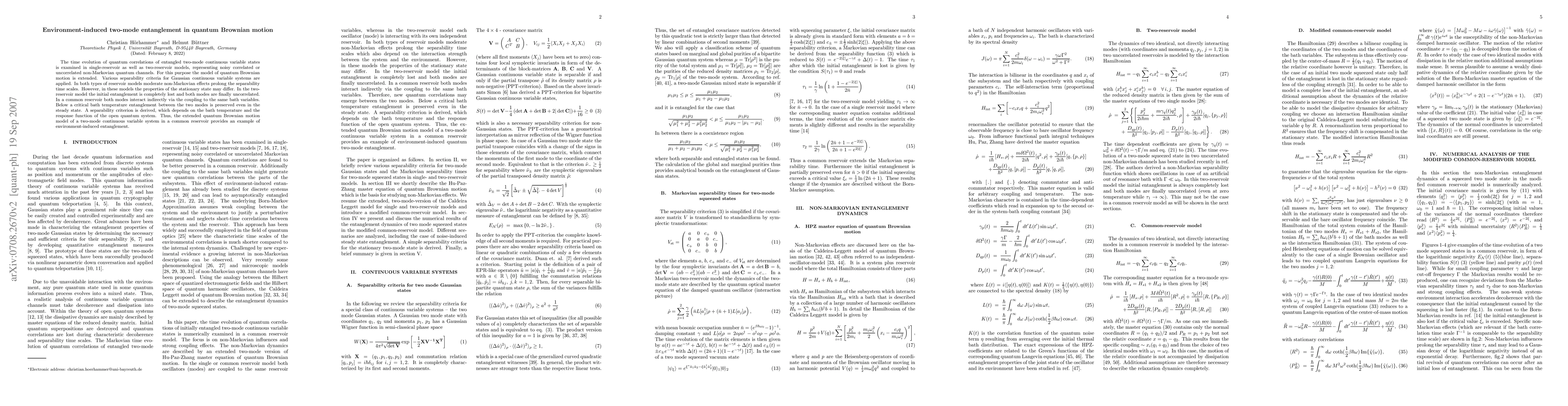 This paper investigates the evolution of entanglement in two-mode quantum systems under quantum Brownian motion, showing that non-Markovian effects prolong entanglement. In a two-reservoir model, initial entanglement is lost, while in a single-reservoir model, entanglement persists below a critical temperature, demonstrating environment-induced entanglement.
