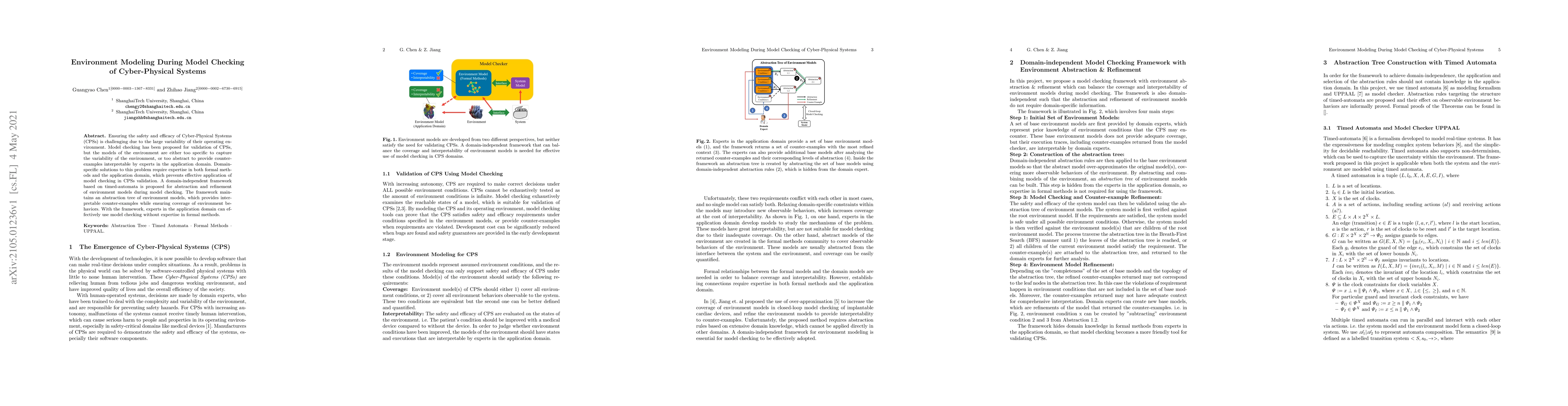 This paper proposes a domain-independent framework for model checking Cyber-Physical Systems (CPSs) using timed-automata to abstract and refine environment models. The framework creates an abstraction tree to provide interpretable counter-examples while covering environment behaviors, enabling application domain experts to use model checking without formal methods expertise.