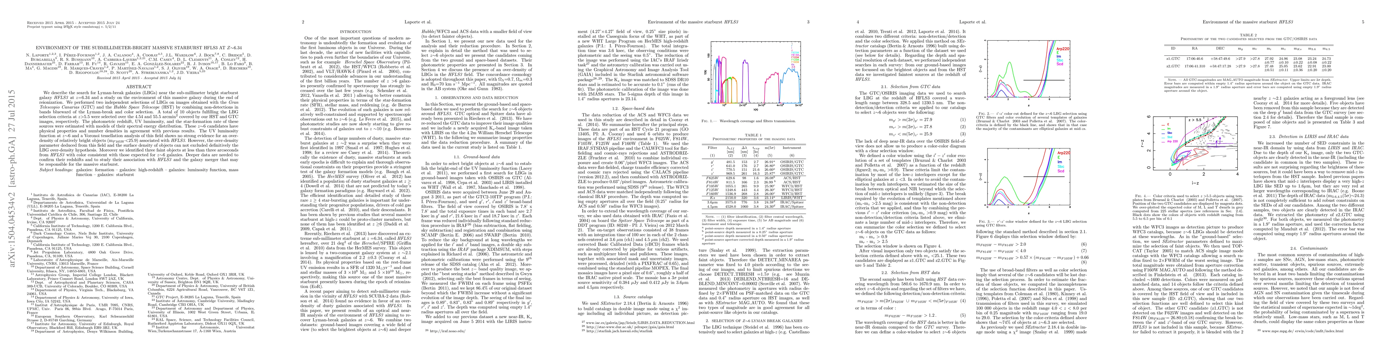 We describe the search for Lyman-break galaxies (LBGs) near the sub-millimeter bright starburst galaxy HFLS3 at $z$$=$6.34 and a study on the environment of this massive galaxy during the end of reionization.We performed two independent selections of LBGs on images obtained with the \textit{Gran Telescopio Canarias} (GTC) and the \textit{Hubble Space Telescope} (HST) by combining non-detections in bands blueward of the Lyman-break and color selection. A total of 10 objects fulfilling the LBG selection criteria at $z$$>$5.5 were selected over the 4.54 and 55.5 arcmin$^2$ covered by our HST and GTC images, respectively. The photometric redshift, UV luminosity, and the star-formation rate of these sources were estimated with models of their spectral energy distribution. These $z$$\sim$6 candidates have physical properties and number densities in agreement with previous results. The UV luminosity function at $z$$\sim$6 and a Voronoi tessellation analysis of this field shows no strong evidence for an overdensity of relatively bright objects (m$_{F105W}$$<$25.9) associated with \textit{HFLS3}. However, the over-density parameter deduced from this field and the surface density of objects can not excluded definitively the LBG over-density hypothesis. Moreover we identified three faint objects at less than three arcseconds from \textit{HFLS3} with color consistent with those expected for $z$$\sim$6 galaxies. Deeper data are needed to confirm their redshifts and to study their association with \textit{HFLS3} and the galaxy merger that may be responsible for the massive starburst.