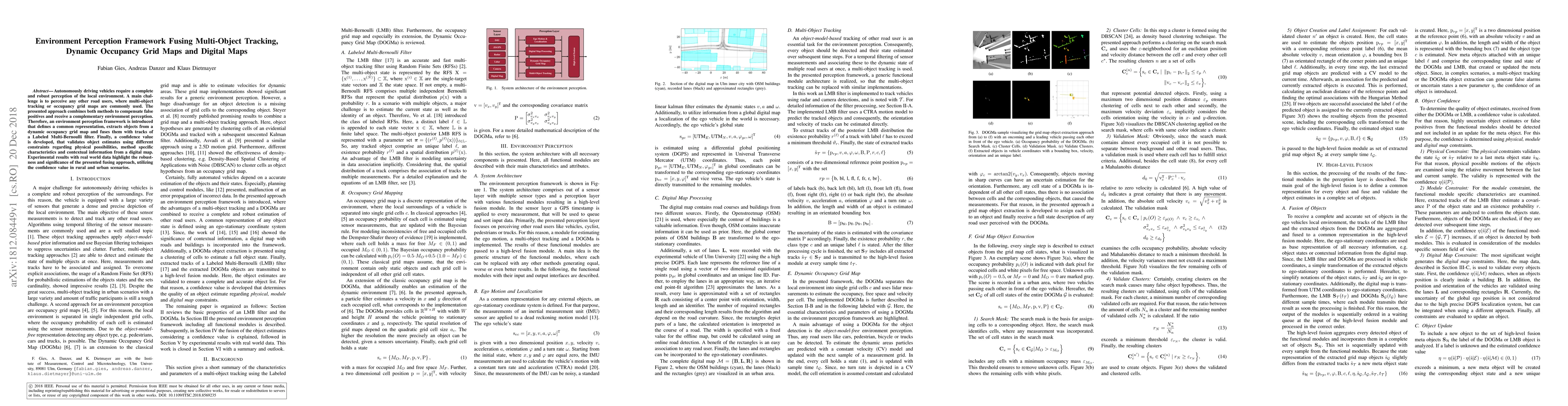 The main technical contribution is the development of an environment perception framework that fuses multi-object tracking, dynamic occupancy grid maps, and digital maps, introducing a confidence value for object validation.
