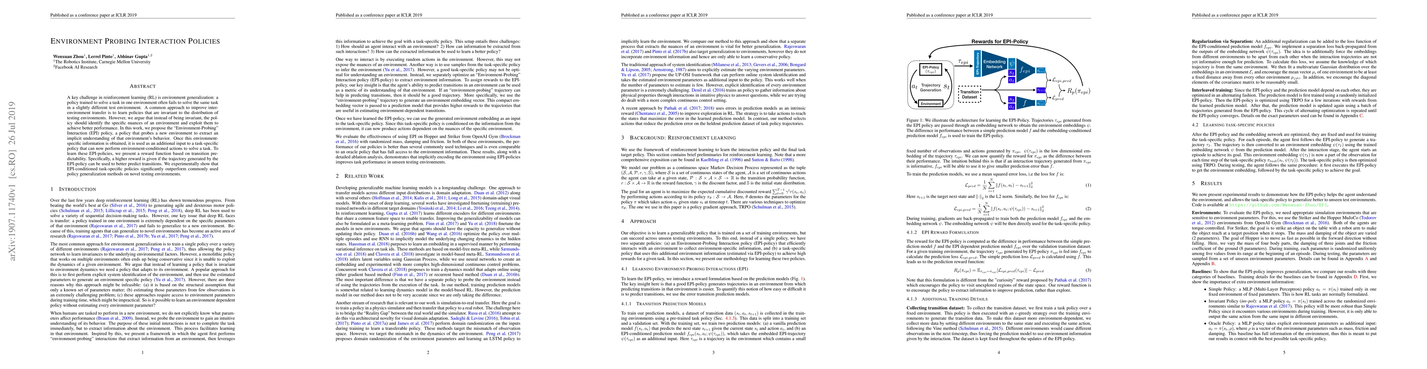 A key challenge in reinforcement learning (RL) is environment generalization: a policy trained to solve a task in one environment often fails to solve the same task in a slightly different test environment. A common approach to improve inter-environment transfer is to learn policies that are invariant to the distribution of testing environments. However, we argue that instead of being invariant, the policy should identify the specific nuances of an environment and exploit them to achieve better performance. In this work, we propose the 'Environment-Probing' Interaction (EPI) policy, a policy that probes a new environment to extract an implicit understanding of that environment's behavior. Once this environment-specific information is obtained, it is used as an additional input to a task-specific policy that can now perform environment-conditioned actions to solve a task. To learn these EPI-policies, we present a reward function based on transition predictability. Specifically, a higher reward is given if the trajectory generated by the EPI-policy can be used to better predict transitions. We experimentally show that EPI-conditioned task-specific policies significantly outperform commonly used policy generalization methods on novel testing environments.
