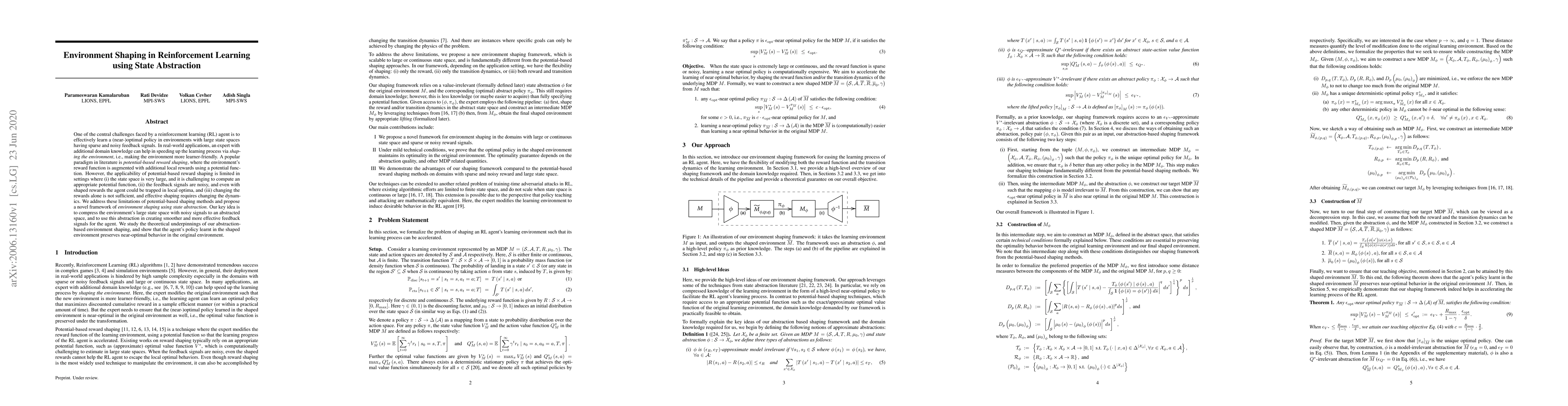 The paper proposes an environment shaping framework in reinforcement learning using state abstraction, addressing limitations of potential-based reward shaping methods in large state spaces with noisy and sparse feedback signals.