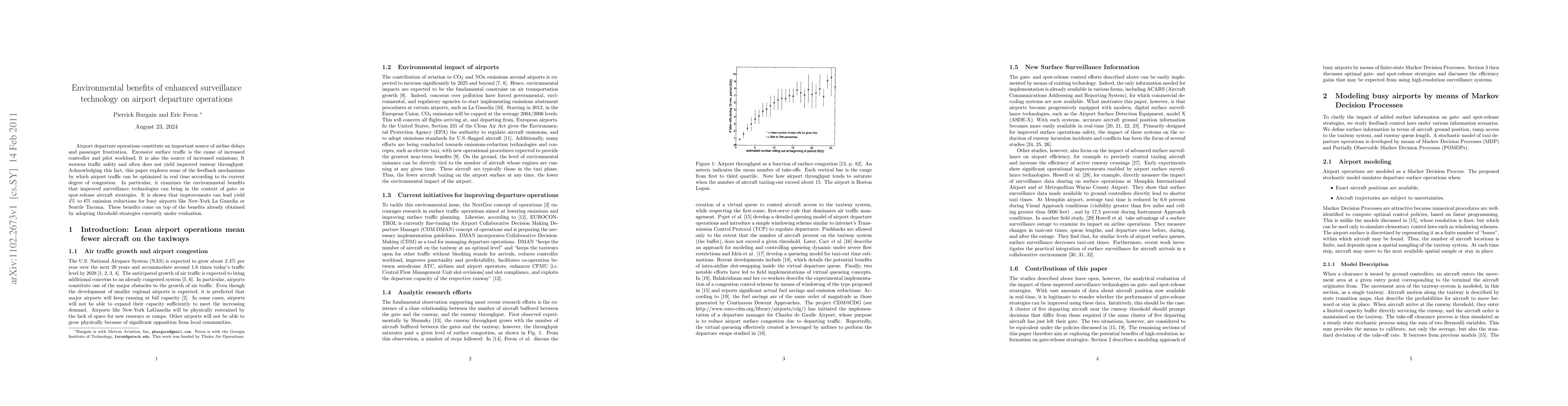 This paper investigates how enhanced surveillance technology can optimize airport departure operations, reducing surface traffic and emissions by 4% to 6% in busy airports like New-York La Guardia or Seattle Tacoma, thereby improving traffic safety and operational efficiency.