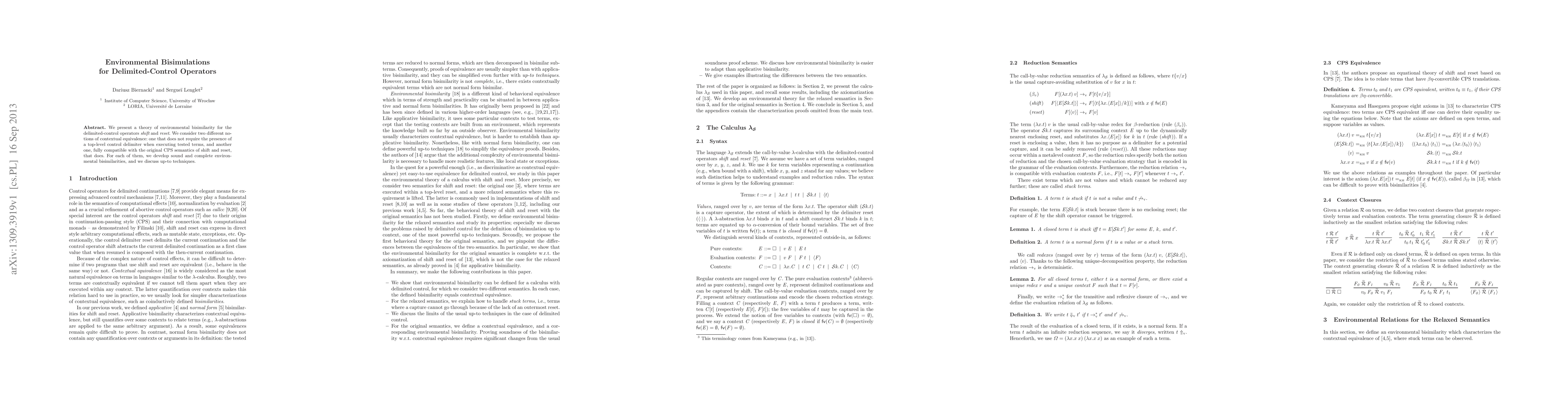 This paper develops a theory of environmental bisimilarity for delimited-control operators shift and reset, presenting two contextual equivalences and corresponding sound and complete bisimilarities, along with up-to techniques.