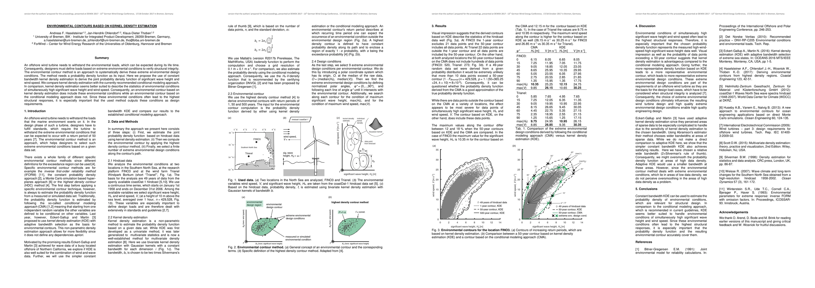 This paper proposes using kernel density estimation to derive joint probability density functions for extreme environmental conditions affecting offshore wind turbines, comparing it to the conditional modeling approach. Kernel density estimation better captures the statistics of simultaneous high wave height and wind speed, which are crucial for structural integrity design.