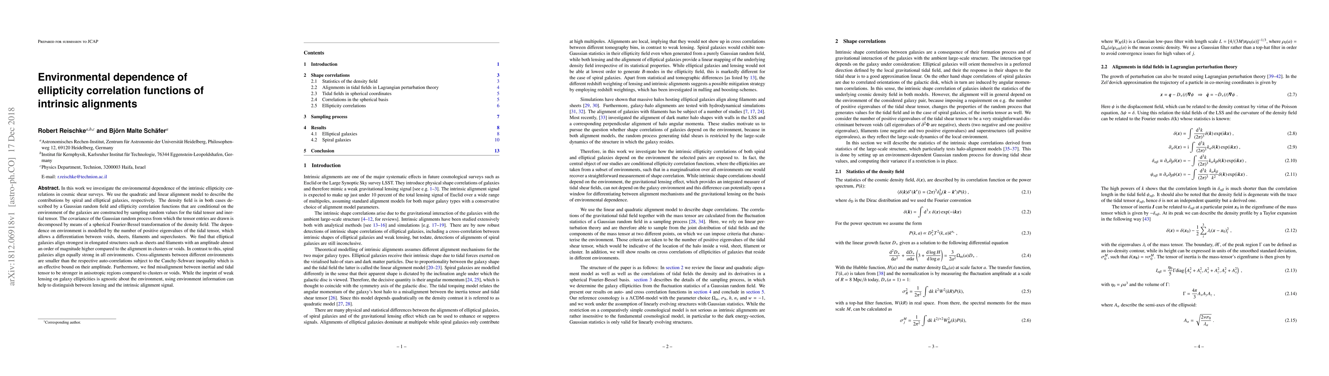 In this work we investigate the environmental dependence of the intrinsic ellipticity correlations in cosmic shear surveys. We use the quadratic and linear alignment model to describe the contributions by spiral and elliptical galaxies, respectively. The density field is in both cases described by a Gaussian random field and ellipticity correlation functions that are conditional on the environment of the galaxies are constructed by sampling random values for the tidal tensor and inertial tensor. The covariance of the Gaussian random process from which the tensor entries are drawn is decomposed by means of a spherical Fourier-Bessel transformation of the density field. The dependence on environment is modelled by the number of positive eigenvalues of the tidal tensor, which allows a differentiation between voids, sheets, filaments and superclusters. We find that elliptical galaxies align strongest in elongated structures such as sheets and filaments with an amplitude almost an order of magnitude higher compared to the alignment in clusters or voids. In contrast to this, spiral galaxies align equally strong in all environments. Cross-alignments between different environments are smaller than the respective auto-correlations subject to the Cauchy-Schwarz inequality which is an effective bound on their amplitude. Furthermore, we find misalignment between inertial and tidal tensor to be stronger in anisotropic regions compared to clusters or voids. While the imprint of weak lensing on galaxy ellipticities is agnostic about the environment, using environment information can help to distinguish between lensing and the intrinsic alignment signal.