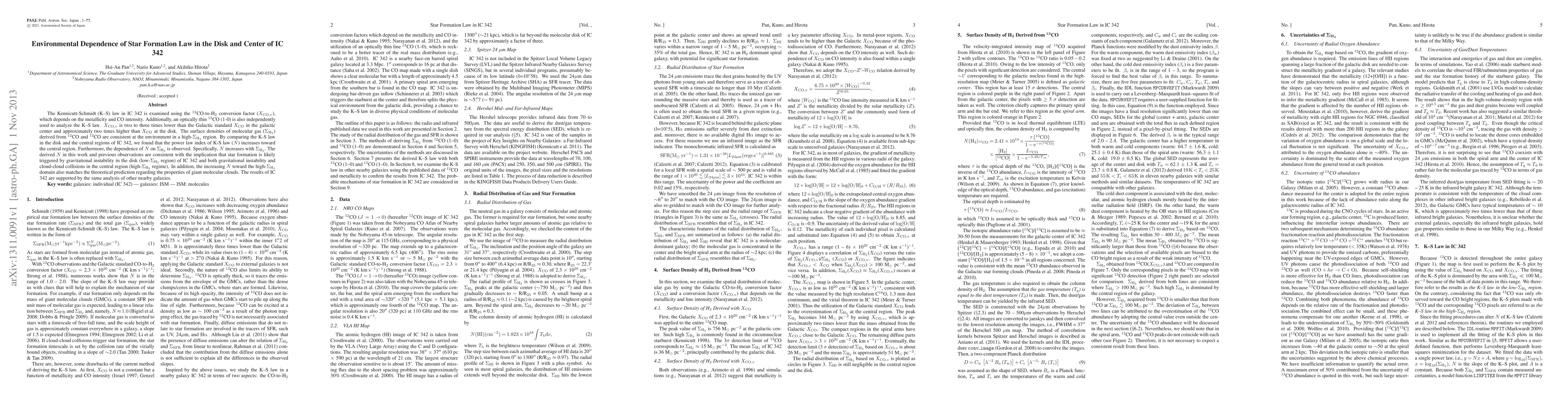 The Kennicutt-Schmidt (K--S) law in IC 342 is examined using the 12CO-to-H2 conversion factor (Xco,v), which depends on the metallicity and CO intensity. Additionally, an optically thin 13CO (1-0) is also independently used to analyze the K--S law. Xco,v is two to three times lower than the Galactic standard Xco in the galactic center and approximately two times higher than Xco at the disk. The surface densities of molecular gas (Sigma_H2) derived from 12CO and 13CO are consistent at the environment in a high-Sigma_H2 region. By comparing the K-S law in the disk and the central regions of IC 342, we found that the power law index of K-S law (N) increases toward the central region. Furthermore, the dependence of N on Sigma_H2 is observed. Specifically, N increases with Sigma_H2. The derived N in this work and previous observations are consistent with the implication that star formation is likely triggered by gravitational instability in the disk (low-Sigma_H2 region) of IC 342 and both gravitational instability and cloud-cloud collisions in the central region (high-Sigma_H2 regime). In addition, the increasing N toward the high-Sigma_H2 domain also matches the theoretical prediction regarding the properties of giant molecular clouds. The results of IC 342 are supported by the same analysis of other nearby galaxies.