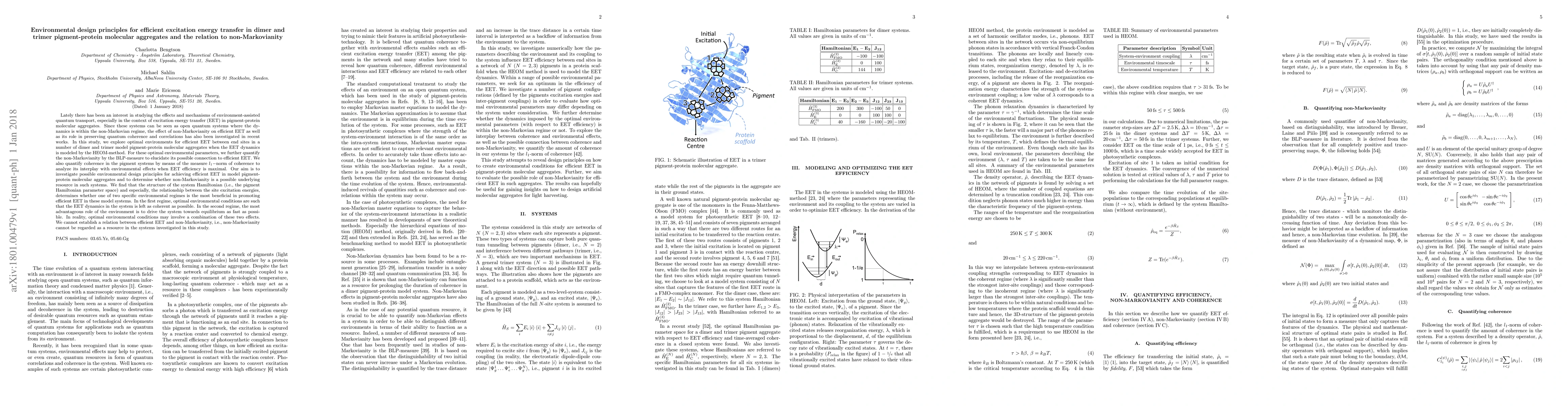 In this study, we explore optimal environments for efficient EET between end sites in a number of dimer and trimer model pigment-protein molecular aggregates when the EET dynamics is modeled by the HEOM-method. For these optimal environmental parameters, we further quantify the non-Markovianity by the BLP-measure to elucidate its possible connection to efficient EET. We also quantify coherence in the pigment systems by means of the measure l1-norm of coherence to analyze its interplay with environmental effects when EET efficiency is maximal. Our aim is to investigate possible environmental design principles for achieving efficient EET in model pigment-protein molecular aggregates and to determine whether non-Markovianity is a possible underlying resource in such systems. We find that the structure of the system Hamiltonian (i.e., the pigment Hamiltonian parameter space) and especially, the relationship between the site excitation energies, determines whether one of two specific environmental regimes is the most beneficial in promoting efficient EET in these model systems. In the first regime, optimal environmental conditions are such that the EET dynamics in the system is left as coherent as possible. In the second regime, the most advantageous role of the environment is to drive the system towards equilibrium as fast as possible. In reality, optimal environmental conditions may involve a combination of these two effects. We cannot establish a relation between efficient EET and non-Markovianity, i.e., non-Markovianity cannot be regarded as a resource in the systems investigated in this study.